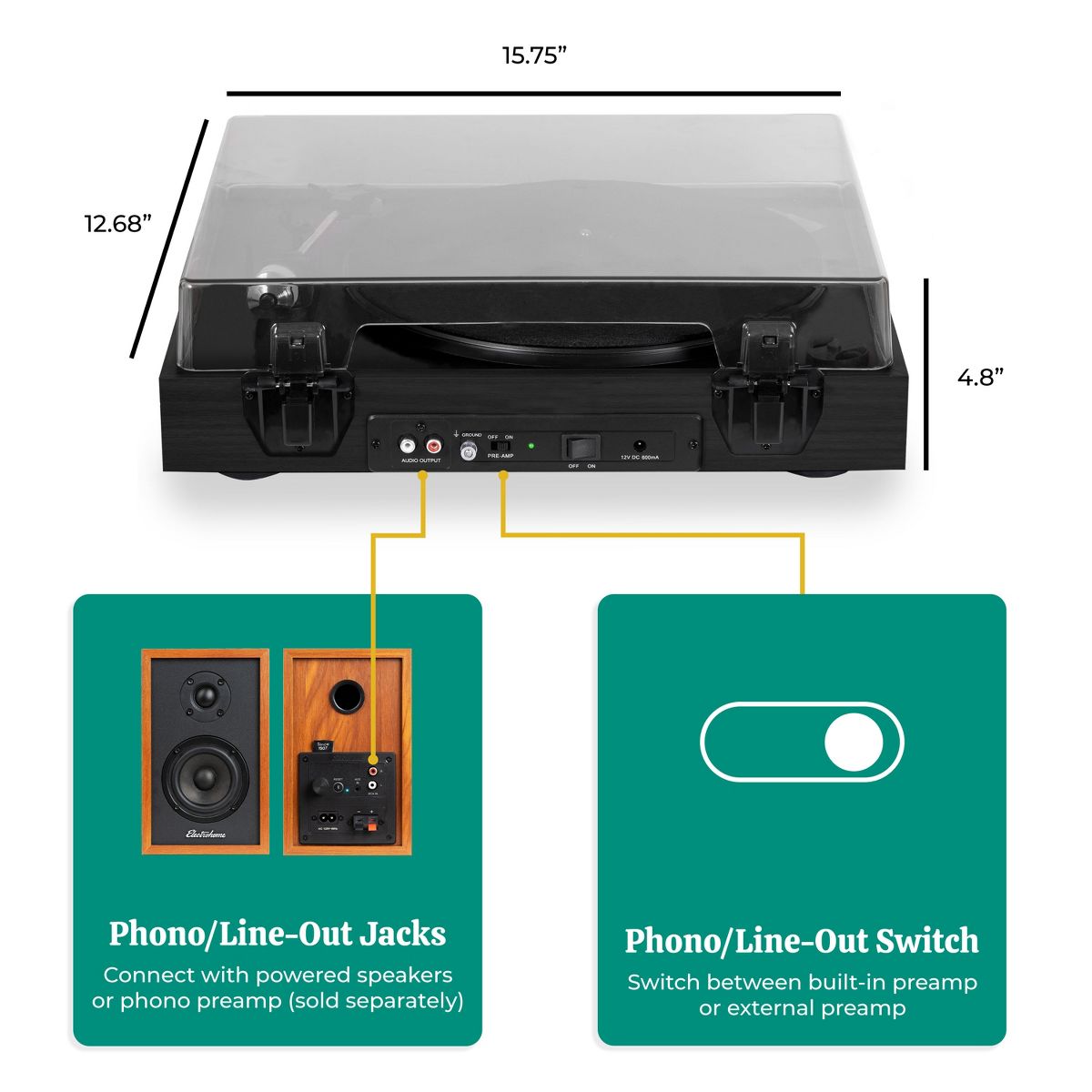 What's Included: Montrose Record Player with Dust Cover, Audio-Technica AT3600L Cartridge (Pre-installed), Felt Turntable Mat, Counterweight, 45 RPM Adapter, 5ft 100V - 240V (50/60Hz) AC Power Adapter, 4ft RCA Cable with Ground Wire, User Manual, 1 Year Manufacturer's Warranty