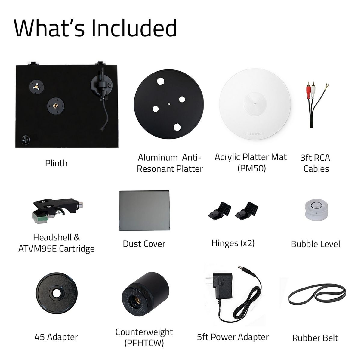 What's Included: RT81P Turntable, Dust Cover, 2x Dust Cover Hinges, Headshell with Audio Technica VM95E Cartridge, Counterweight (PFHTCW), Aluminum Anti-Resonant Platter, Acrylic Platter Mat, Rubber Belt, 45 Adapter, Bubble Level, 3ft RCA Cable With Ground Wire (PFHTCA), 5ft 100V - 240V (50/60Hz) AC Power Adapter, User Manual, 2 Year Manufacturer's Warranty