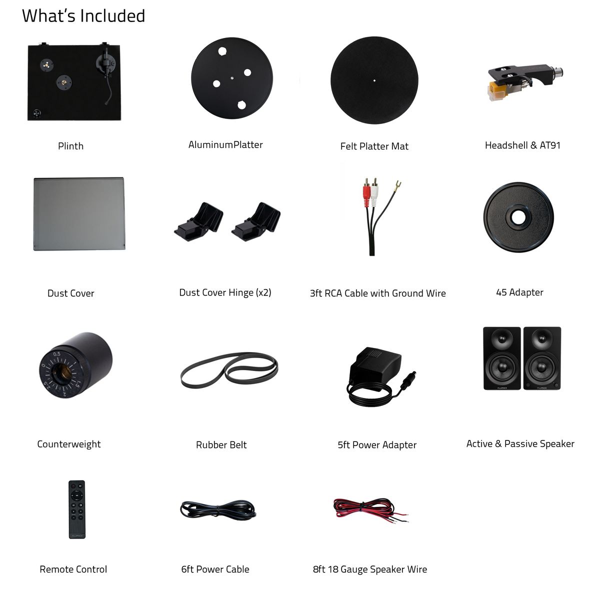What's Included: RT80 Turntable, Dust Cover, 2x Dust Cover Hinges, Headshell with Audio Technica AT91 Cartridge, Counterweight, Aluminum Platter, Rubber Belt, 45 Adapter, Felt Platter Mat, 3ft RCA Cable With Ground Wire, 5ft 100V - 240V (50/60Hz) AC Power Adapter, User Manual, Ai41 Powered Bookshelf Speakers (pair), Remote Control, 2x AAA Batteries, 6ft Power Cable, 8ft 18 Gauge Speaker Wire, Quick Start Guide, Fluance Catalog, 2 Year Manufacturer's Warranty