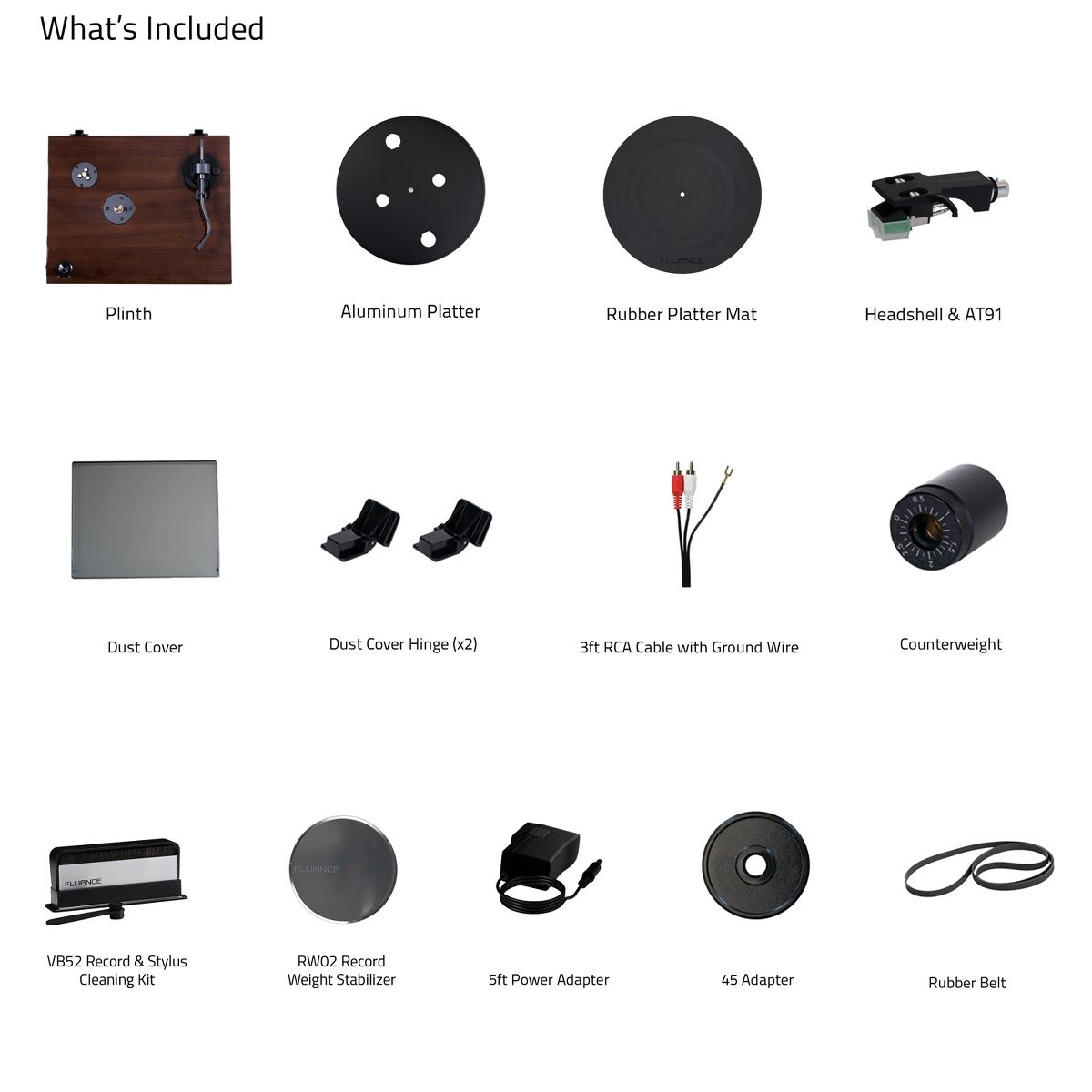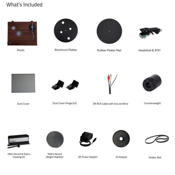 What's Included: RT81 Turntable, Dust Cover, 45 Adapter, Rubber Platter Mat, 3ft RCA With Ground Wire, 100V - 240V (50/60Hz) AC Power Adapter, Record Weight (RW02), Vinyl Record Cleaning Kit (VB52), Quick Start Guide, 2 Year Manufacturer's Warranty