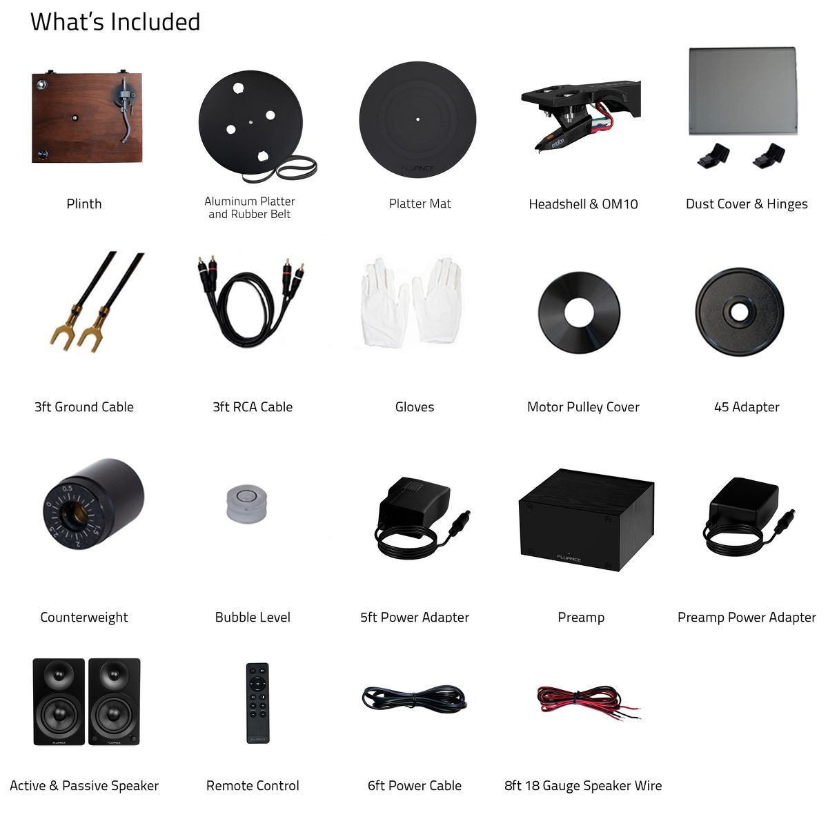 What's Included: RT82 Turntable, Dust Cover + Hinges, Bubble Level, Headshell with Ortofon OM 10 Cartridge, Counterweight, Metal Platter with Belt, Rubber Platter Mat, 5ft 100-240V (50/60Hz) AC Power Adapter, 2x 3ft 90pF RCA Cable, 3ft Ground Wire, 45 Adaptor, Motor Pulley Cap, User Manual, PA10 Unit, Power Adapter, Ai41 Powered Bookshelf Speakers (pair), Remote Control, 2x AAA Batteries, 6ft Power Cable, 8ft 18 Gauge Speaker Wire, Quick Start Guide, 2 Year Manufacturer's Warranty
