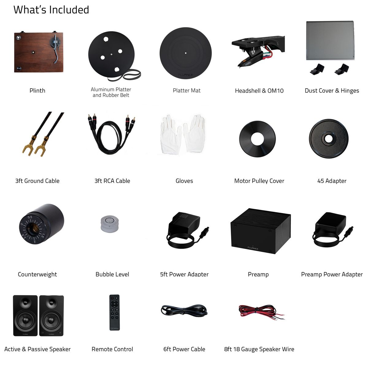 What's Included: RT82 Turntable, Dust Cover + Hinges, Bubble Level, Headshell with Ortofon OM 10 Cartridge, Counterweight, Metal Platter with Belt, Rubber Platter Mat, 5ft 100-240V (50/60Hz) AC Power Adapter, 2x 3ft 90pF RCA Cable, 3ft Ground Wire, 45 Adaptor, Motor Pulley Cap, User Manual, PA10 Unit, Power Adapter, Ai61 Powered Bookshelf Speakers (pair), Remote Control, 2x AAA Batteries, 6ft Power Cable, 8ft 18 Gauge Speaker Wire, Quick Start Guide, 2 Year Manufacturer's Warranty