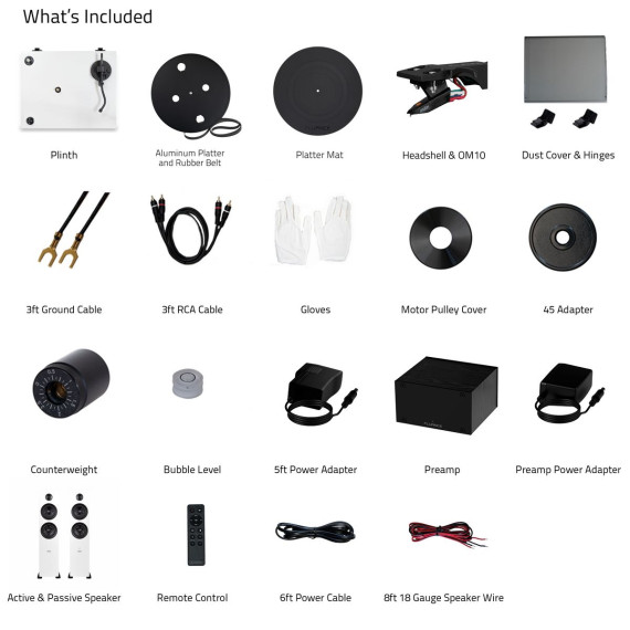 What's Included: RT82 Turntable, Dust Cover, 2x Hinges, Bubble Level, Headshell with Ortofon OM10 Cartridge, Counterweight, Metal Platter with Belt, Rubber Platter Mat, 100-240V (50/60Hz) AC Power Adapter, 3ft RCA Cable, 2x 3ft Ground Wire, 45 Adaptor, Motor Pulley Cap, Ai81 Powered Floorstanding Speakers (pair), Remote Control, 2x AAA Batteries, 6ft Power Cable, 8ft 18 Gauge Speaker Wire, Quick Start Guide, PA10 Unit, Power Adapter, User Manual, 2 Year Manufacturer's Warranty