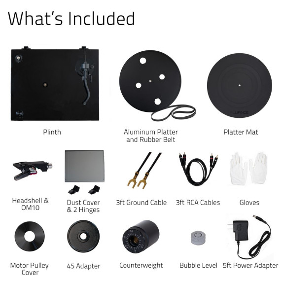 What's Included: RT82 Turntable, Dust Cover + Hinges, Bubble Level, Headshell with Ortofon OM10 Cartridge, Counterweight, Metal Platter with Belt, Rubber Platter Mat, 100-240V (50/60Hz) AC Power Adapter, 3ft RCA Cable, 2x 3ft Ground Wire, 45 Adaptor, Motor Pulley Cap, Cotton Gloves, User Manual, 2 Year Manufacturer's Direct Warranty
