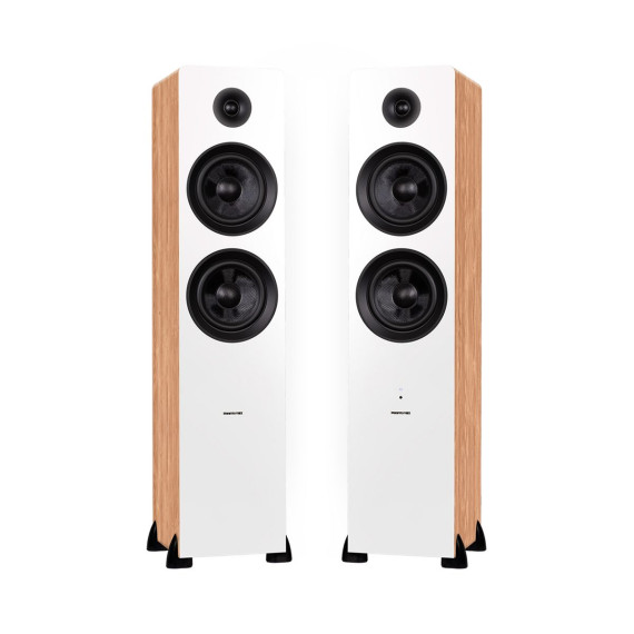 These active floorstanding speakers feature neodymium silk-dome tweeters for clear, natural highs with dual 6.5" woven glass fiber drivers for optimal linearity that produce detailed mids and deep bass for exceptional music playback. Enhanced with DSP to produce a more balanced frequency response, and an integrated 150-watt class D amplifier that delivers a robust, powerful sound.