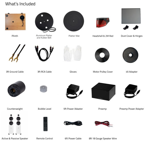 What's Included: RT83 Turntable, Dust Cover, 2x Hinges, Bubble Level, Headshell with Ortofon 2M Red Cartridge, Counterweight, Metal Platter with Belt, Rubber Platter Mat, 5ft 100 - 240 V (50/60Hz) AC Power Adapter, 3ft RCA Cable, 3ft Ground Wire, 45 Adaptor, Motor Pulley Cap, Ai81 Powered Floorstanding Speakers (pair), Remote Control, 2x AAA Batteries, 6ft Power Cable, 8ft 18 Gauge Speaker Wire, Quick Start Guide, PA10 Unit, Power Adapter, User Manual, 2 Year Manufacturer's Warranty