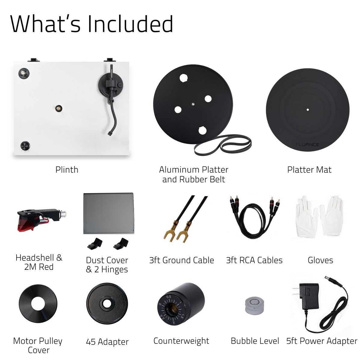 What's Included: RT83 Turntable, Dust Cover + Hinges, Bubble Level, Headshell with Ortofon 2M Red Cartridge, Counterweight, Metal Platter with Belt, Rubber Platter Mat, 100-240V (50/60Hz) AC Power Adapter, 3ft RCA Cable, 2x 3ft Ground Wire, 45 Adaptor, Motor Pulley Cap, Cotton Gloves, User Manual, 2 Year Manufacturer's Direct Warranty