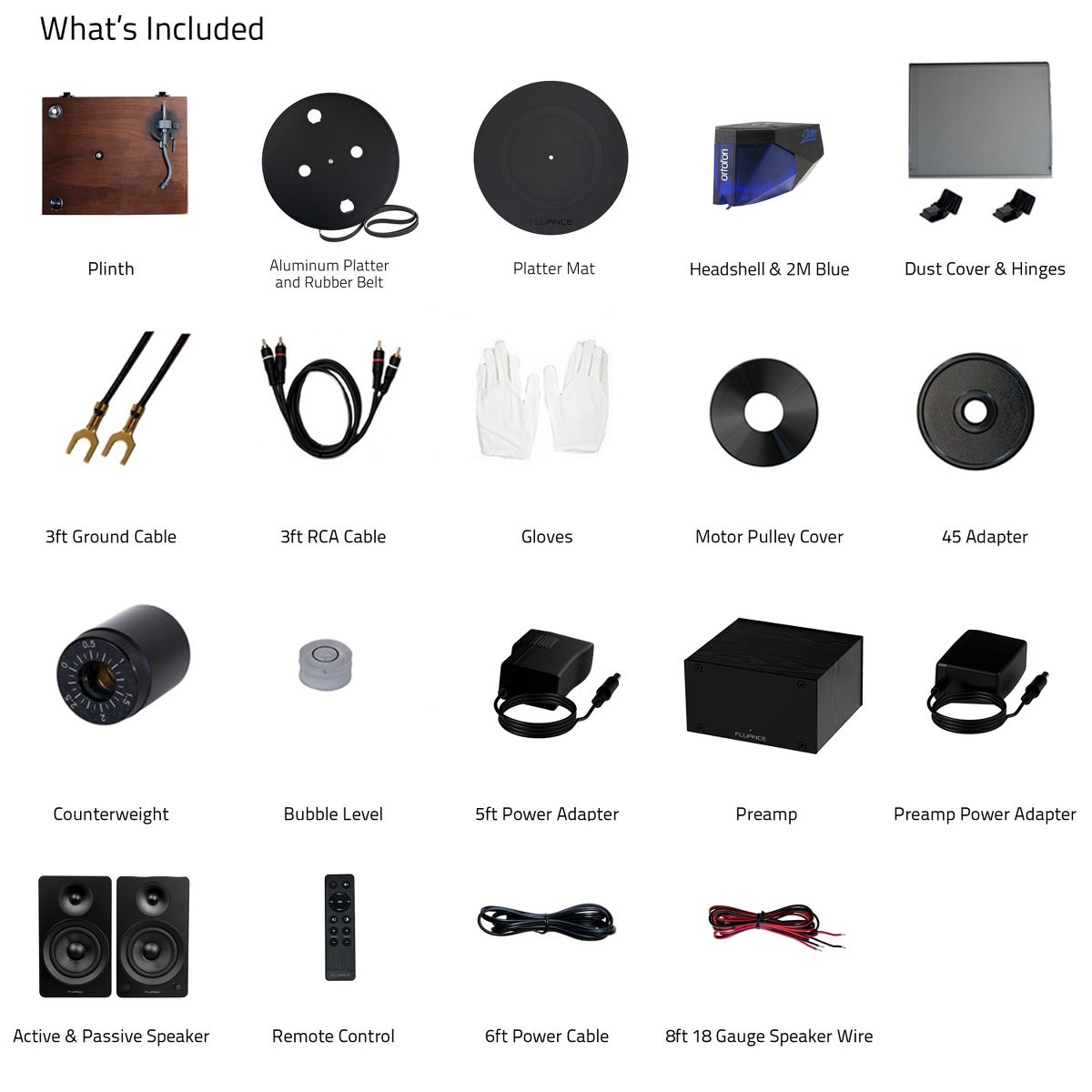 What's Included: RT84 Turntable, Dust Cover + Hinges, Bubble Level, Headshell with Ortofon 2M Blue Cartridge, Counterweight, Metal Platter with Belt, Rubber Platter Mat, 5ft 100-240V (50/60Hz) AC Power Adapter, 2x 3ft 90pF RCA Cable, 3ft Ground Wire, 45 Adaptor, Motor Pulley Cap, User Manual, PA10 Unit, Power Adapter, Ai61 Powered Bookshelf Speakers (pair), Remote Control, 2x AAA Batteries, 6ft Power Cable, 8ft 18 Gauge Speaker Wire, Quick Start Guide, 2 Year Manufacturer's Warranty