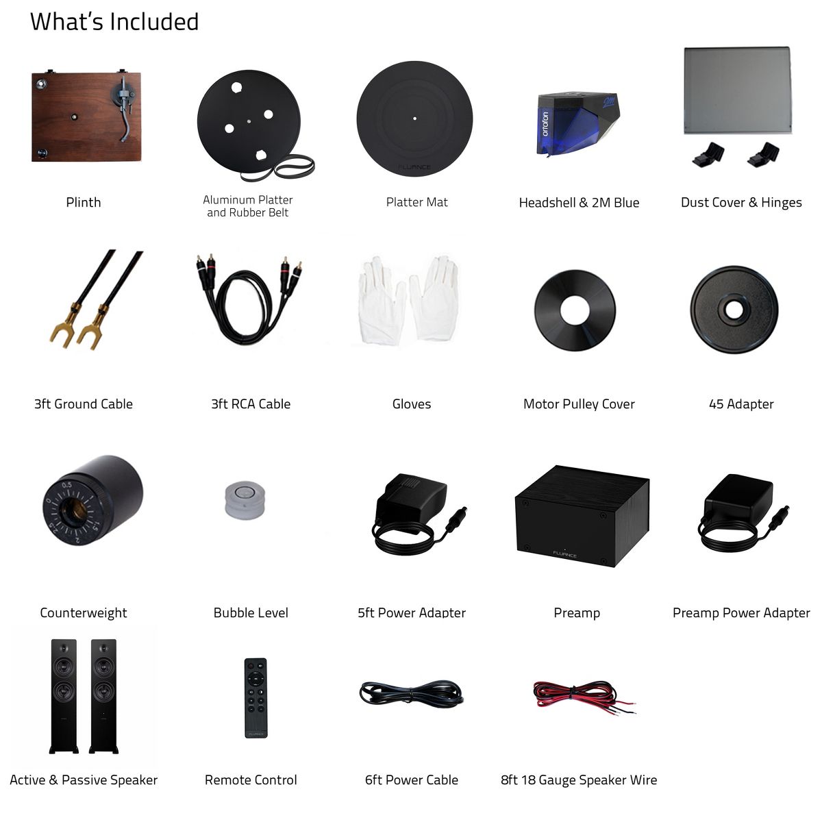 What's Included: RT84 Turntable, Dust Cover, 2x Hinges, Bubble Level, Headshell with Ortofon 2M Blue Cartridge, Counterweight, Metal Platter with Belt, Rubber Platter Mat, 5ft 100 - 240 V (50/60Hz) AC Power Adapter, 3ft RCA Cable, 3ft Ground Wire, 45 Adaptor, Motor Pulley Cap, Ai81 Powered Floorstanding Speakers (pair), Remote Control, 2x AAA Batteries, 6ft Power Cable, 8ft 18 Gauge Speaker Wire, Quick Start Guide, PA10 Unit, Power Adapter, User Manual, 2 Year Manufacturer's Warranty