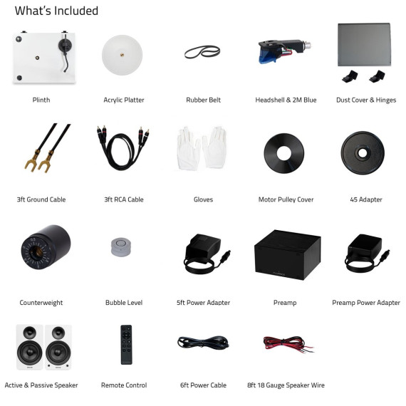 What's Included: RT85 Turntable, Dust Cover + Hinges, Bubble Level, Headshell with Ortofon 2M Blue Cartridge, Counterweight, Acrylic Platter with Belt, Rubber Platter Mat, 5ft 100-240V (50/60Hz) AC Power Adapter, 2x 3ft 90pF RCA Cable, 3ft Ground Wire, 45 Adaptor, Motor Pulley Cap, User Manual, PA10 Unit, Power Adapter, Ai61 Powered Bookshelf Speakers (pair), Remote Control, 2x AAA Batteries, 6ft Power Cable, 8ft 18 Gauge Speaker Wire, Quick Start Guide, 2 Year Manufacturer's Warranty
