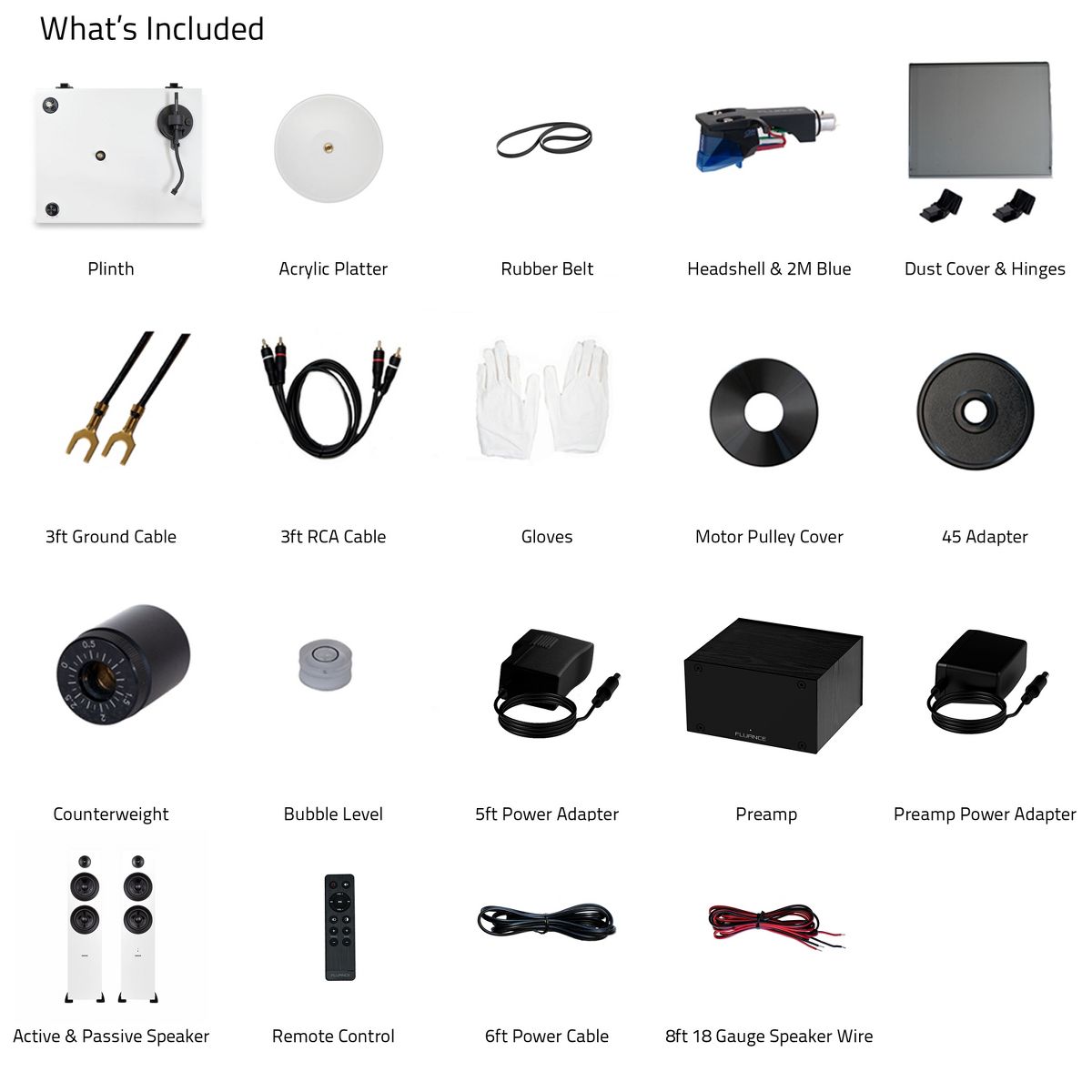 What's Included: RT85 Turntable, Dust Cover, 2x Hinges, Bubble Level, Headshell with Ortofon 2M Blue Cartridge, Counterweight, Acrylic Platter with Belt, 5ft 100 - 240 V (50/60Hz) AC Power Adapter, 3ft RCA Cable, 3ft Ground Wire, 45 Adaptor, Motor Pulley Cap, Cotton Gloves, Ai81 Powered Floorstanding Speakers (pair), Remote Control, 2x AAA Batteries, 6ft Power Cable, 8ft 18 Gauge Speaker Wire, Quick Start Guide, PA10 Unit, Power Adapter, User Manual, 2 Year Manufacturer's Warranty