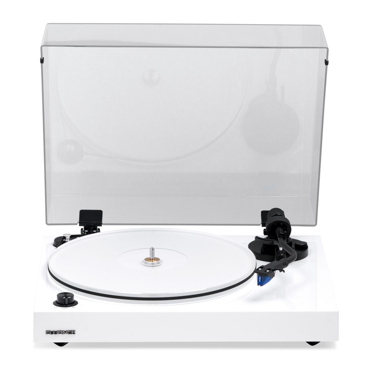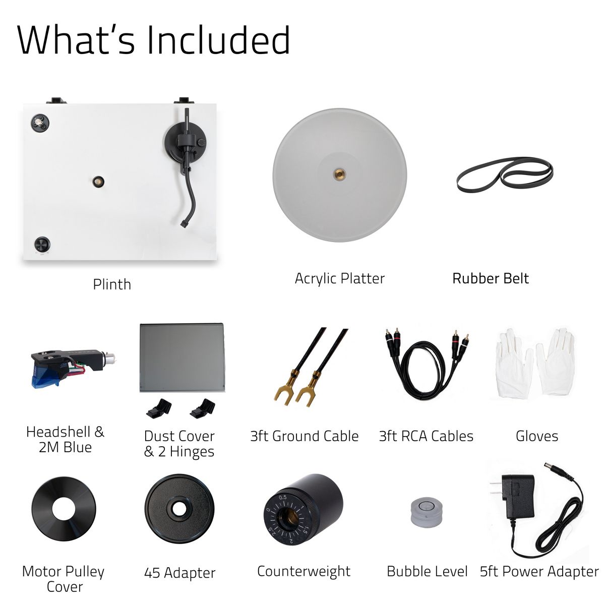 What's Included: RT85 Turntable, Dust Cover + Hinges, Bubble Level, Headshell with Ortofon 2M Blue Cartridge, Counterweight, Acrylic Platter with Belt, 100-240V (50/60Hz) AC Power Adapter, 3ft RCA Cable, 2x 3ft Ground Wire, 45 Adaptor, Motor Pulley Cap, Cotton Gloves, User Manual, 2 Year Manufacturer's Direct Warranty