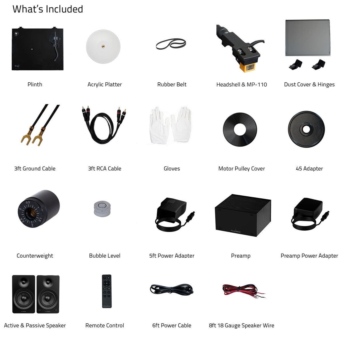 What's Included: RT85N Turntable, Dust Cover + Hinges, Bubble Level, Headshell with Nagaoka MP-110 Cartridge, Counterweight, Acrylic Platter with Belt, 100-240V (50/60Hz) AC Power Adapter, 3ft RCA Cable, 2x 3ft Ground Wire, 45 Adaptor, Motor Pulley Cap, Cotton Gloves, Ai61 Powered Bookshelf Speakers (pair), Remote Control, 2x AAA Batteries, 6ft Power Cable, 8ft 18 Gauge Speaker Wire, Quick Start Guide, 2 Year Manufacturer's Warranty