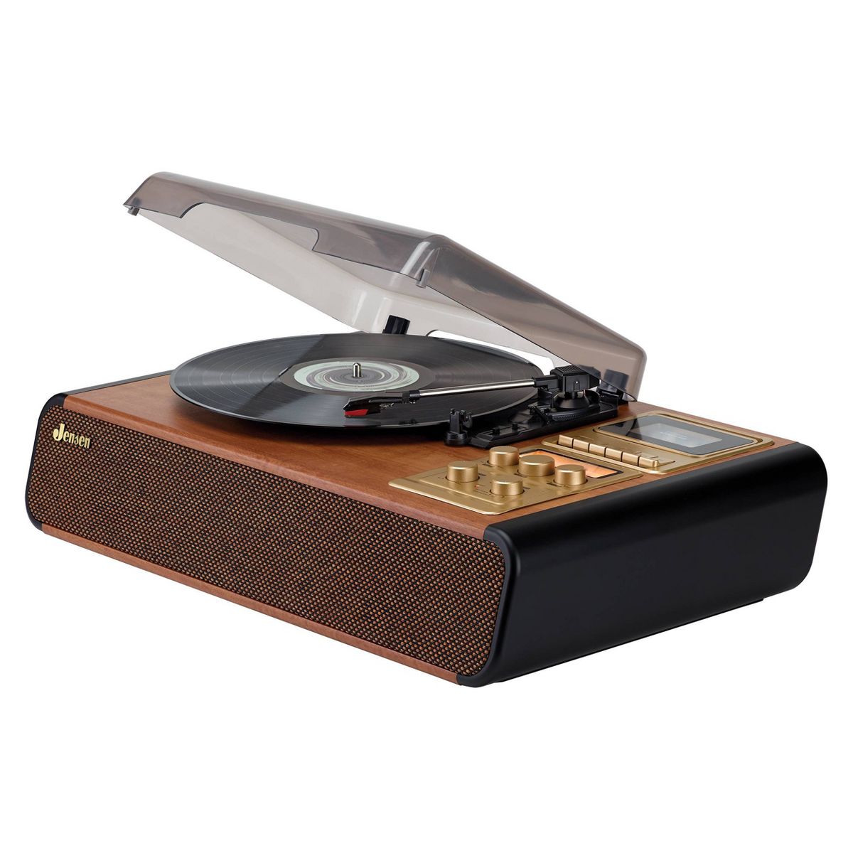 Enjoy your music any way you want to with the JENSEN® JTA-385. This belt-driven 3-speed turntable with pitch control includes two built-in speakers, AM/FM receiver with back-lit analog tuning dial, aux-in, headphone and RCA line-out jacks. The built-in cassette player/recorder lets you play your favorite cassettes as well as record directly from turntable, radio, or aux-in. This turntable also features a vintage throwback style with design elements like woodgrain finish, woven fabric speaker covers, gold cabinet accents and our classic JENSEN® logo. The unit also includes a tone control, 45 RPM record adaptor, and it operates on 120V AC power.