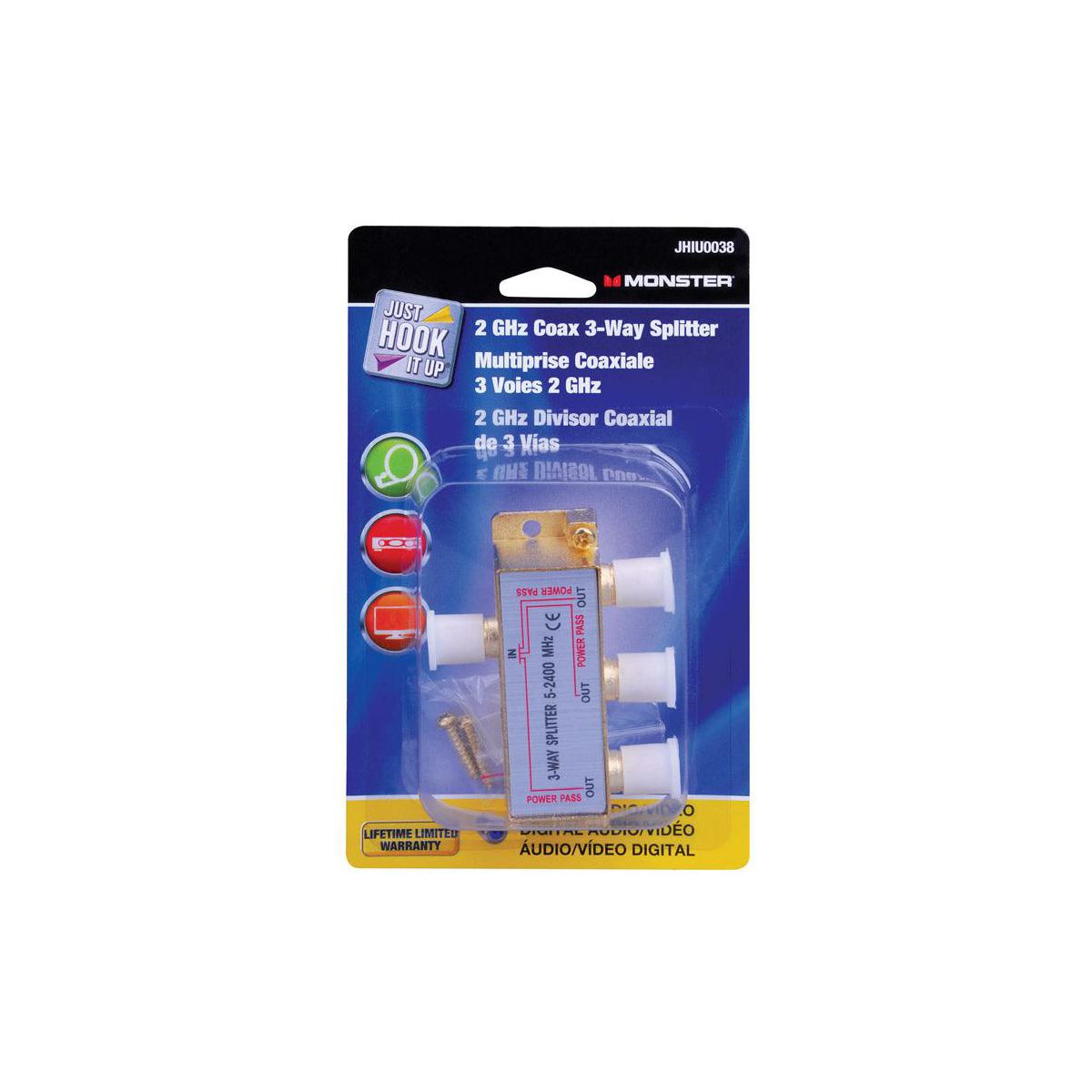 Monster JHIU0038 Just Hook It Up 3 Way Coax Splitter, Nickel