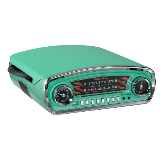 Get ready to enjoy your new and old vinyls with this Studebaker SB6057 3-Speed Turntable! With glossy paint right off a ‘57 Chevy this unit not only sounds great using its stereo speaker system, but will WOW your friends with its retro style complete with chrome push button controls just like on your Chevy. Complete with AM/FM stereo radio, this baby will give you hours of listening pleasure. What’s that: you moved a lot of your music onto your smart device? No problem, this unit also has Bluetooth capabilities so you can stream your music, podcasts, or anything else from your new devices. You can even choose MP3 playback thought the unit’s USB port. Complete jack pack for private listening or connecting other gear. Can you dig it?