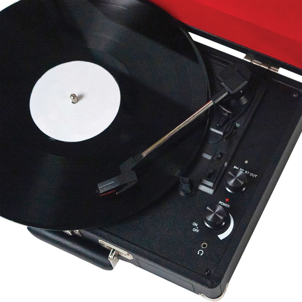 The Victor® Metro Dual-Bluetooth® Suitcase Turntable is ready to play your vinyl records on its 3-speed turntable. The Dual Bluetooth® feature allows streaming of your vinyl records to your own external Bluetooth® speaker or plays audio from your smart device through the Metro's built-in speakers. The 3.5-mm aux input and RCA stereo audio output allow for even more additional playback options. The convenient carrying handle and clasp let you transport your record player to new locations with easy portability.