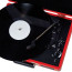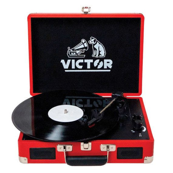 The Victor® Metro Dual-Bluetooth® Suitcase Turntable is ready to play your vinyl records on its 3-speed turntable. The Dual Bluetooth® feature allows streaming of your vinyl records to your own external Bluetooth® speaker or plays audio from your smart device through the Metro's built-in speakers. The 3.5-mm aux input and RCA stereo audio output allow for even more additional playback options. The convenient carrying handle and clasp let you transport your record player to new locations with easy portability.