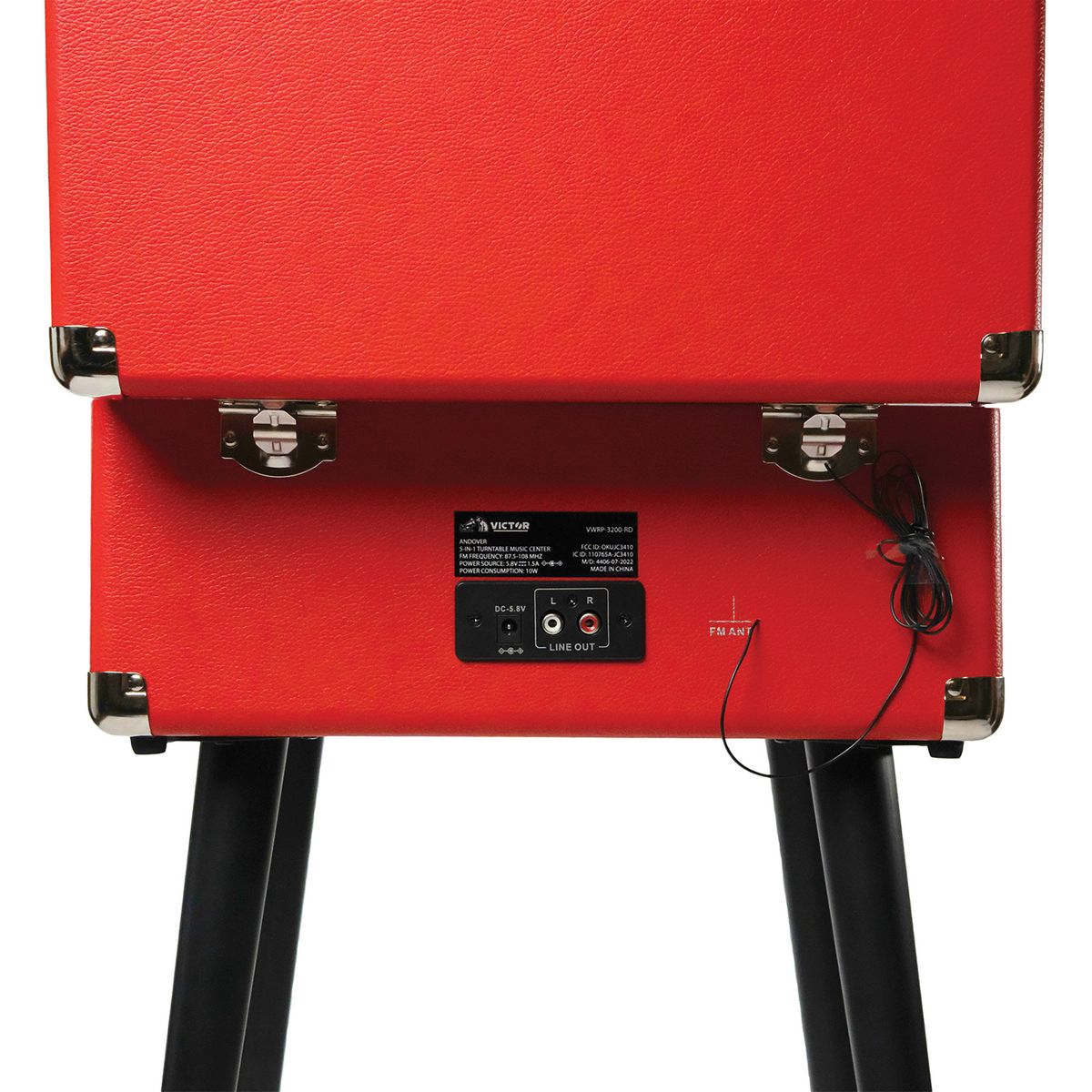 The Victor® Andover 5-in-1 Suitcase-Style Record Player features chair height legs for a fun retro style. The built-in 3-speed turntable and FM radio are ready to play all your favorite songs! The Dual-Bluetooth® feature allows streaming of your vinyl records to an external Bluetooth® speaker (sold separately) or plays music from your smart device through Andover's built-in speakers. The 3.5-mm aux Input and RCA stereo output allow for even more additional playback options. The Andover can also be used on a tabletop as base height feet are included.