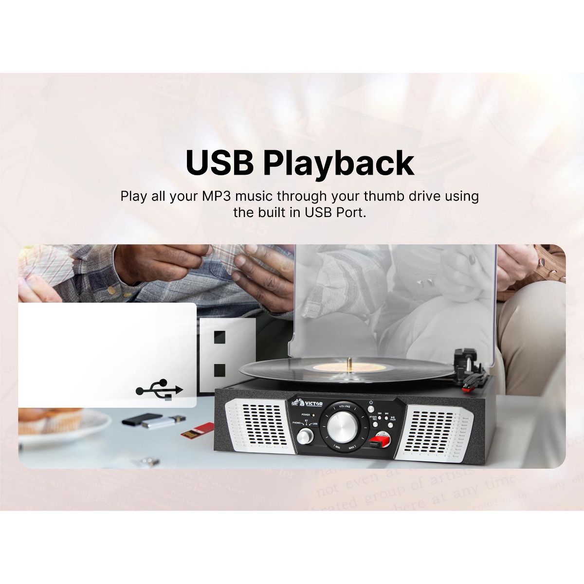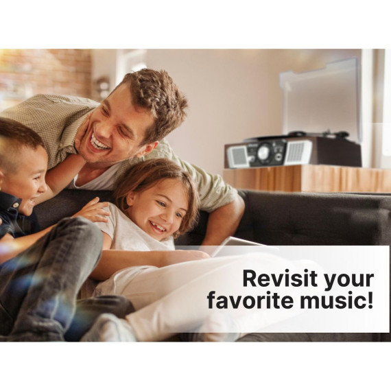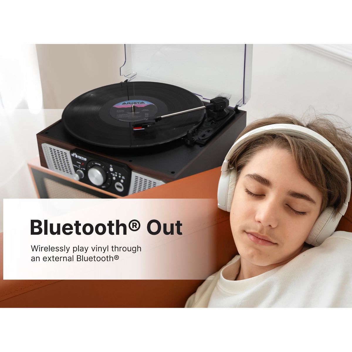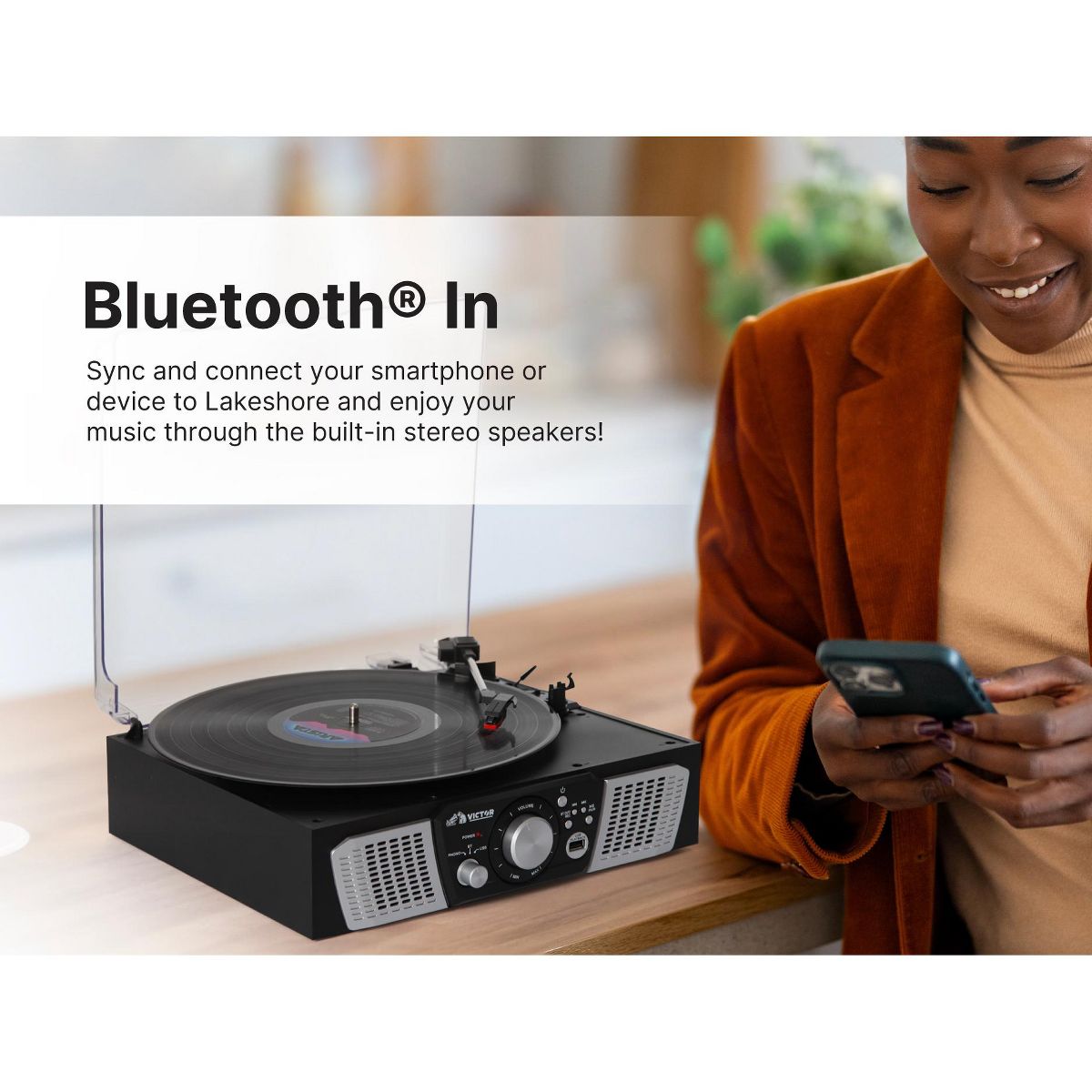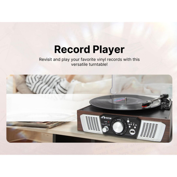 Victor Lakeshore 5-in-1 Turntable is ready to play your vinyl records with the built in 3-Speed Turntable! The Dual Bluetooth feature allows streaming of your vinyl records to an external Bluetooth Speaker or plays music from your Smart Device through the Lakeshore's built in Speakers. Placing a thumb Drive into the USB Slot allows easy Recording and Playback of your Albums. The 3.5mm Aux Input & RCA Audio Output allow for even more additional Playback options.