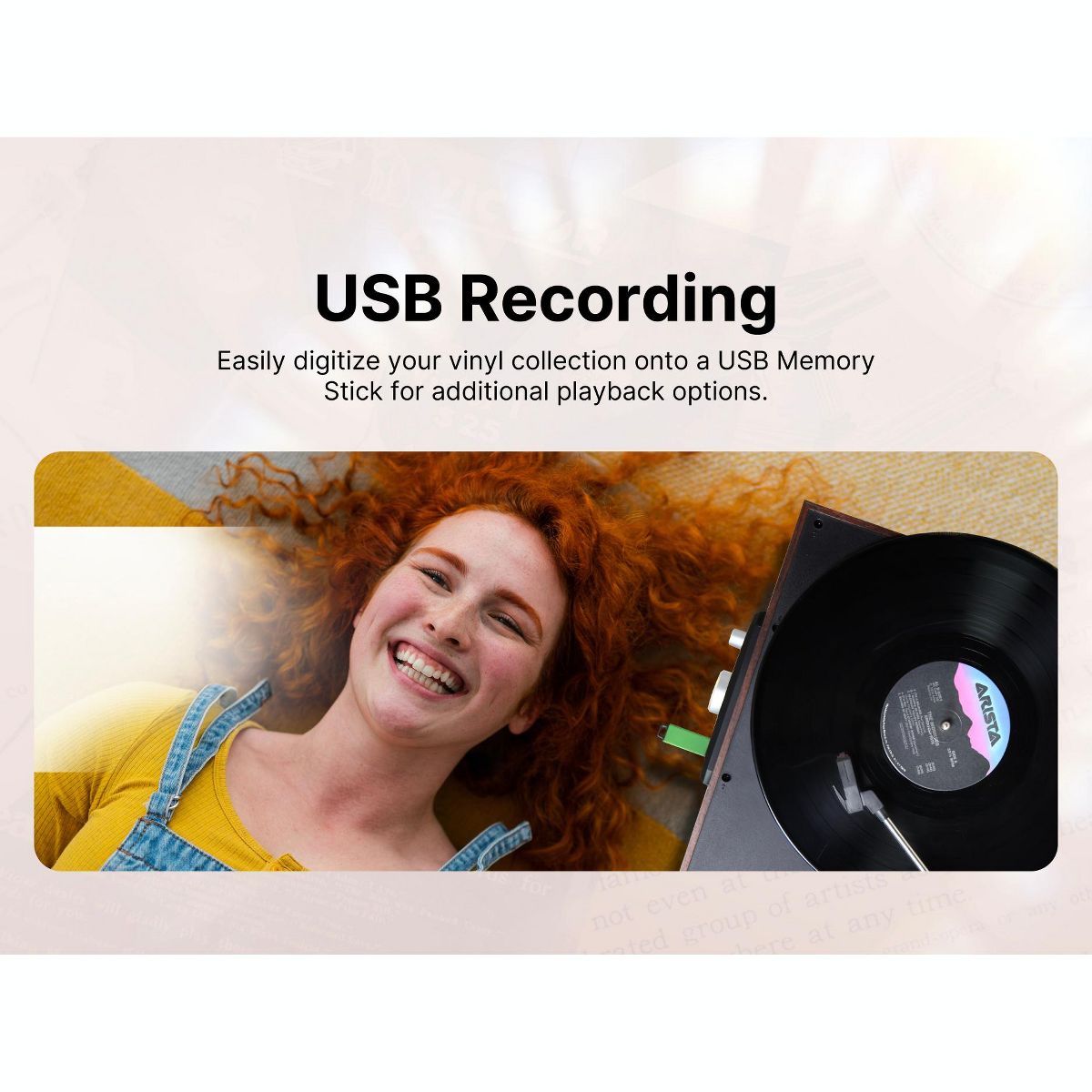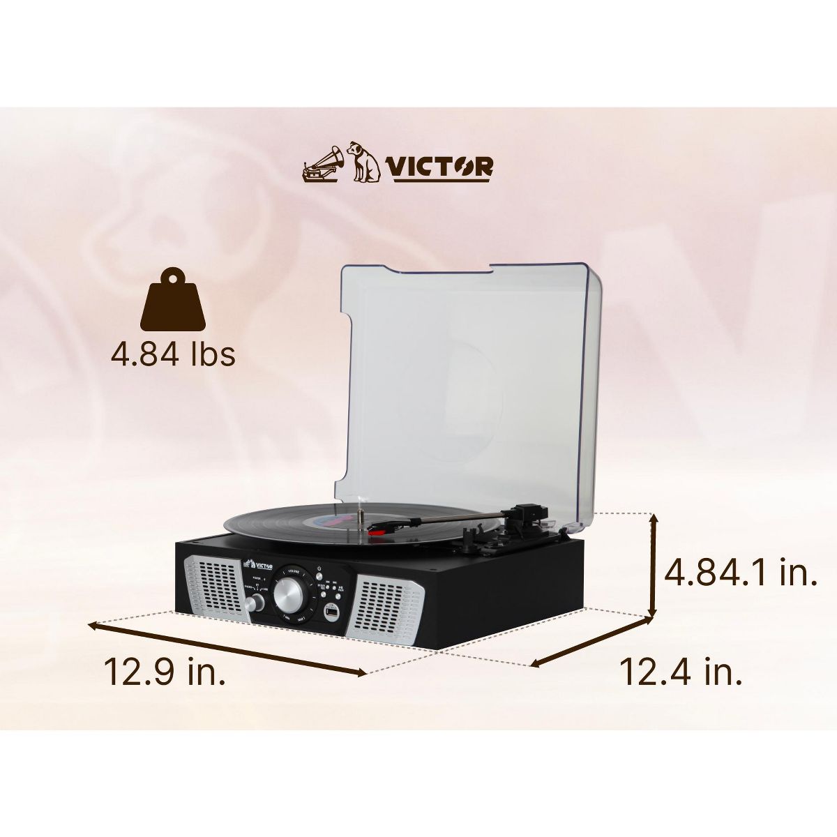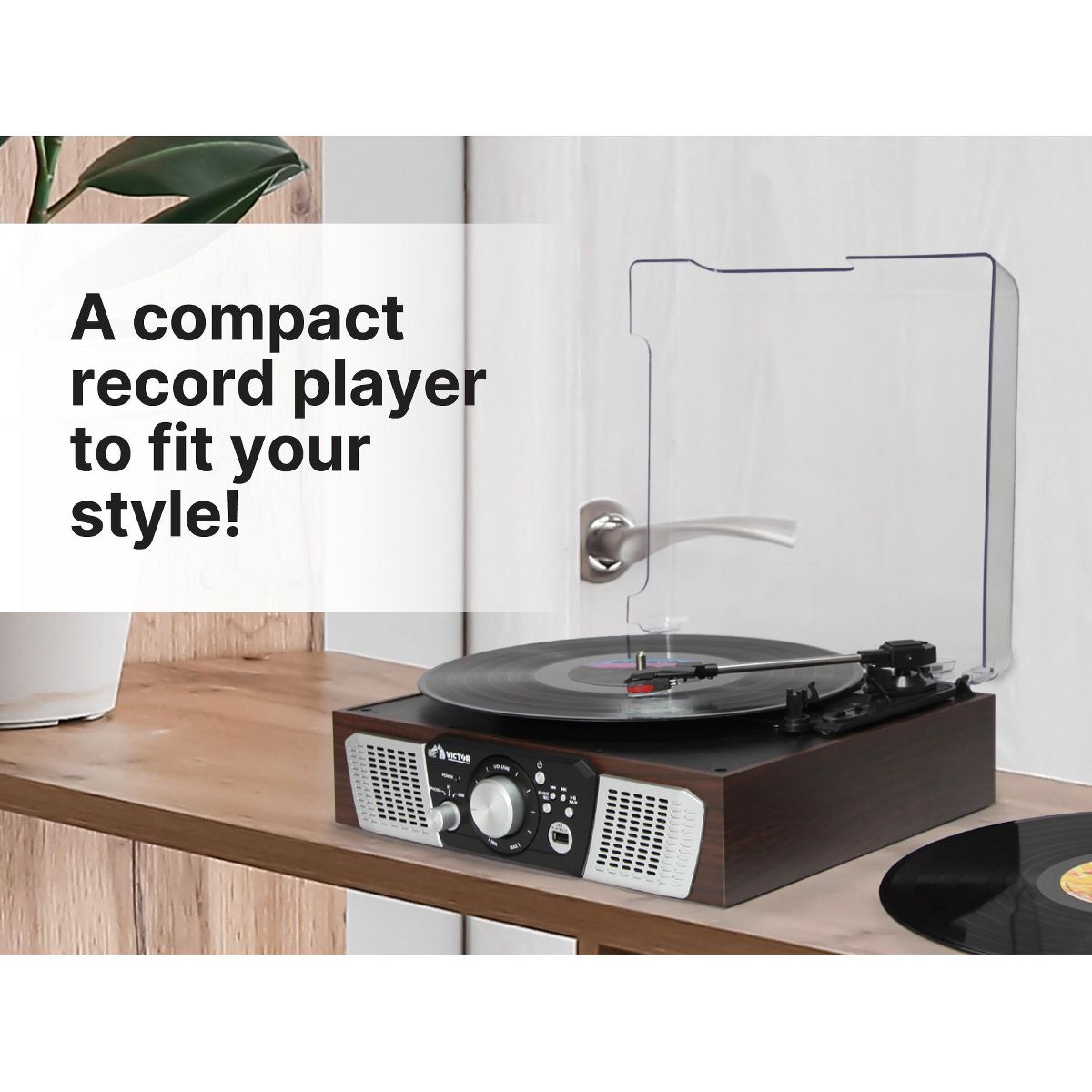 Victor Lakeshore 5-in-1 Turntable is ready to play your vinyl records with the built in 3-Speed Turntable! The Dual Bluetooth feature allows streaming of your vinyl records to an external Bluetooth Speaker or plays music from your Smart Device through the Lakeshore's built in Speakers. Placing a thumb Drive into the USB Slot allows easy Recording and Playback of your Albums. The 3.5mm Aux Input & RCA Audio Output allow for even more additional Playback options.
