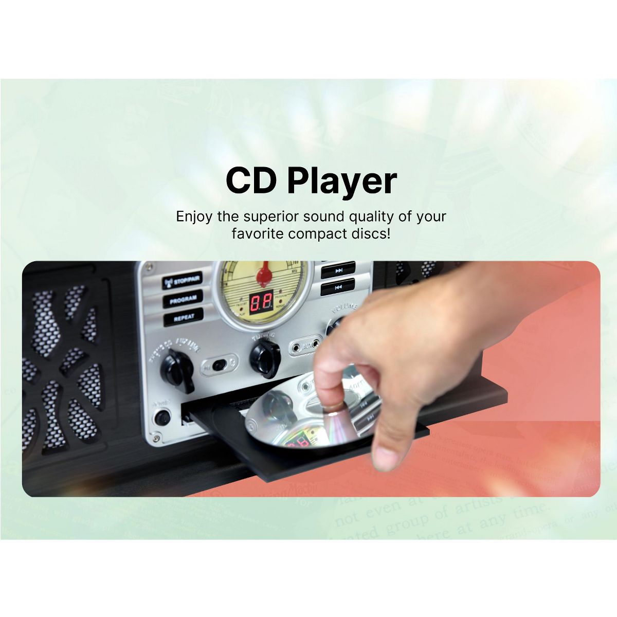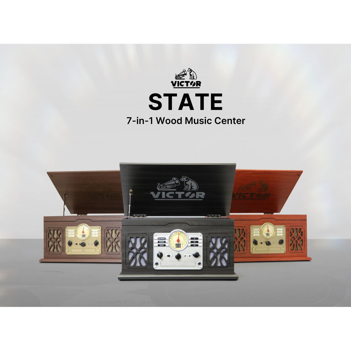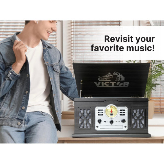 VICTOR State 7-in-1 Turntable Music Center with 3-Speed Record Player, CD/MP3/Cassette Player, FM Radio, Dual Bluetooth In & Out, and Built-in Stereo