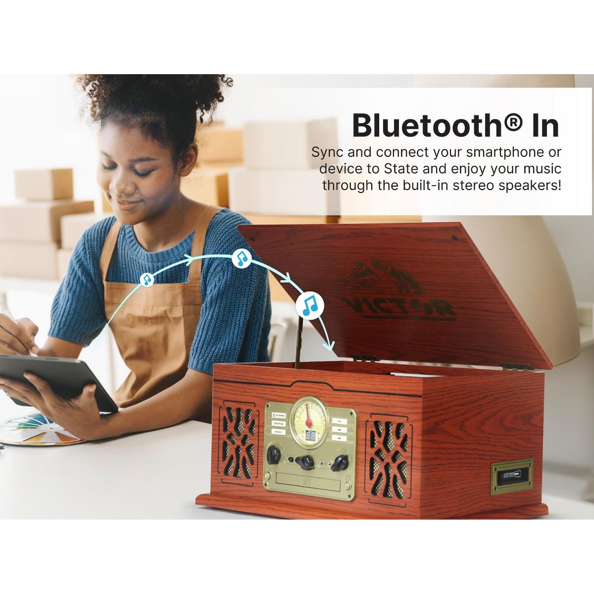 VICTOR State 7-in-1 Turntable Music Center with 3-Speed Record Player, CD/MP3/Cassette Player, FM Radio, Dual Bluetooth In & Out, and Built-in Stereo