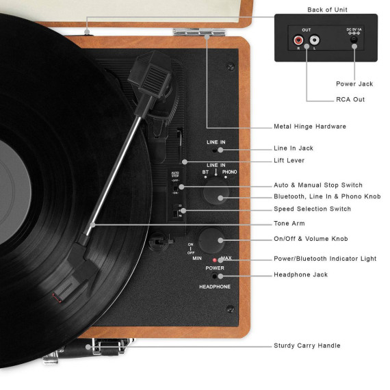 Victrola's Journey portable suitcase record player is a classic, loaded with features like an easy carry handle, so you to listen to your favorite tunes wherever you are! Built-in stereo speakers provide crisp, clear sound, or you can plug in your favorite headphones and get lost in the music. The suitcase record player features a 3-speed, belt-driven turntable to reduce vibration, as well as wireless Bluetooth connectivity, so you can listen from up to 33 feet away. In your home or on the go, your music will never be far!