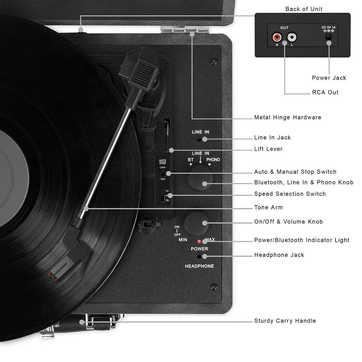 Victrola's Journey portable suitcase record player is a classic, loaded with features like an easy carry handle, so you to listen to your favorite tunes wherever you are! Built-in stereo speakers provide crisp, clear sound, or you can plug in your favorite headphones and get lost in the music. The suitcase record player features a 3-speed, belt-driven turntable to reduce vibration, as well as wireless Bluetooth connectivity, so you can listen from up to 33 feet away. In your home or on the go, your music will never be far!