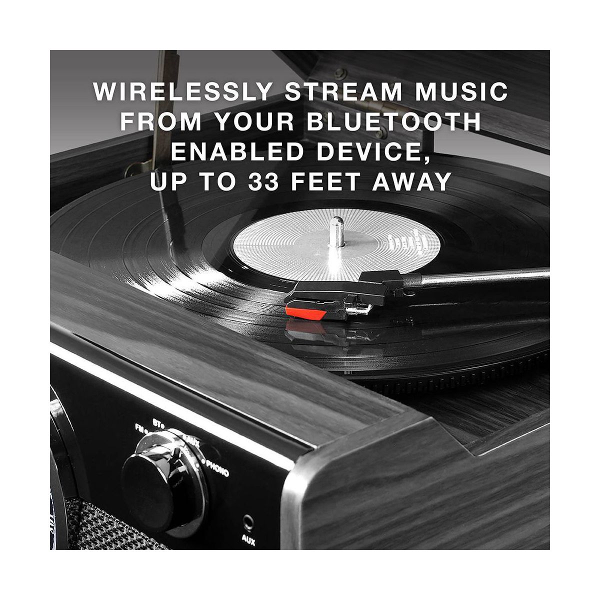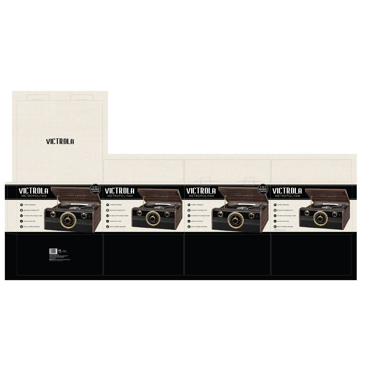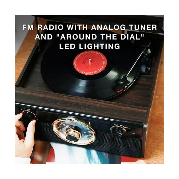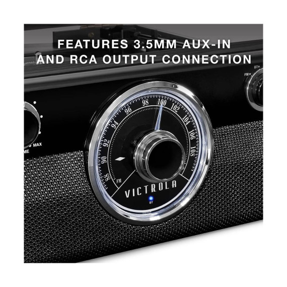 Our Victrola Metropolitan 4-in-1 Record Player combines a Mid-Century Modern look with a classic rotary tuner with beautiful "around the dial" LED lighting while still maintaining the latest technology for your convenient listening enjoyment. Stream your music via Bluetooth, or play your favorite tunes on the Radio, from the 3-speed turntable, or thru a 3.5mm Auxiliary input.