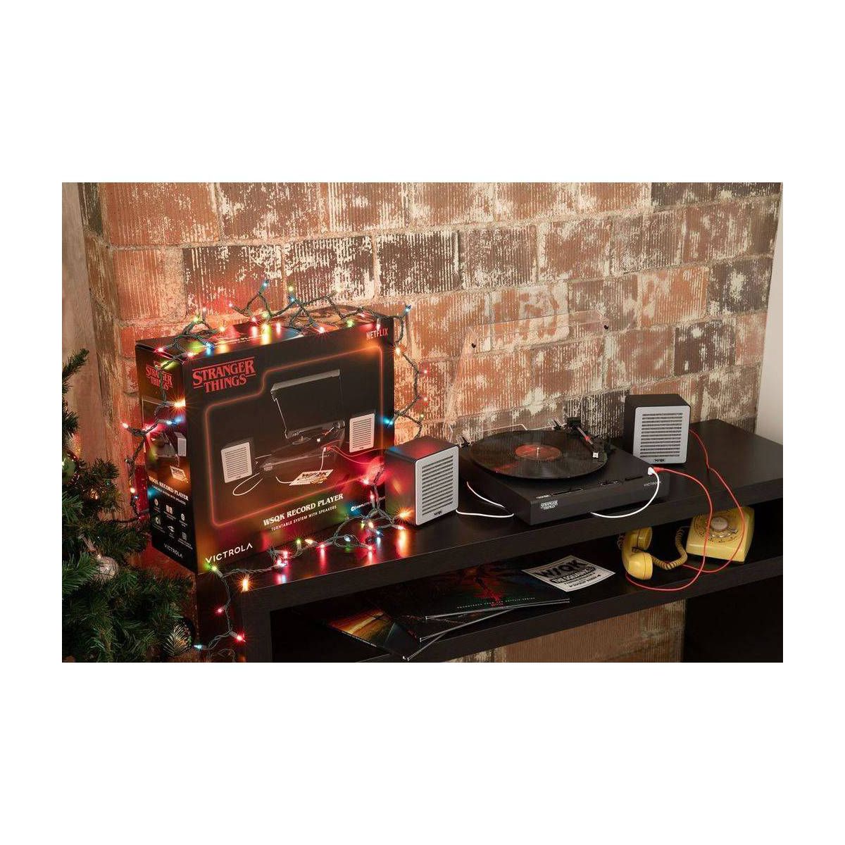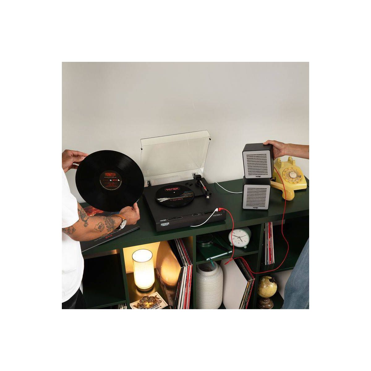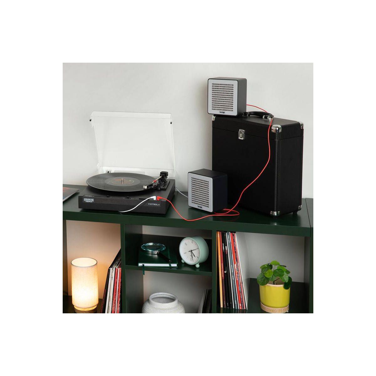 Celebrate the final chapter of Stranger Things with the Victrola WSQK Record Player. This limited-edition turntable features a custom WSQK felt slipmat and wired speakers designed to echo the chaotic energy of the WSQK control room. Place your speakers however you like, there are no rules here. Stack them, stagger them, or even flip them...Upside Down!