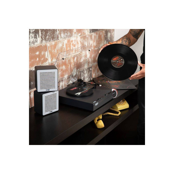 The 3-speed turntable features an ATN3600L moving magnet cartridge and a removable dust cover. Stream music from a Bluetooth device or play vinyl to external Bluetooth headphones or speakers using VINYLSTREAM Bluetooth output.