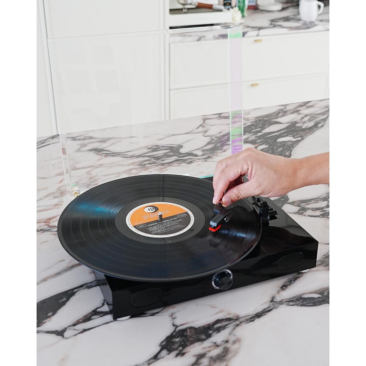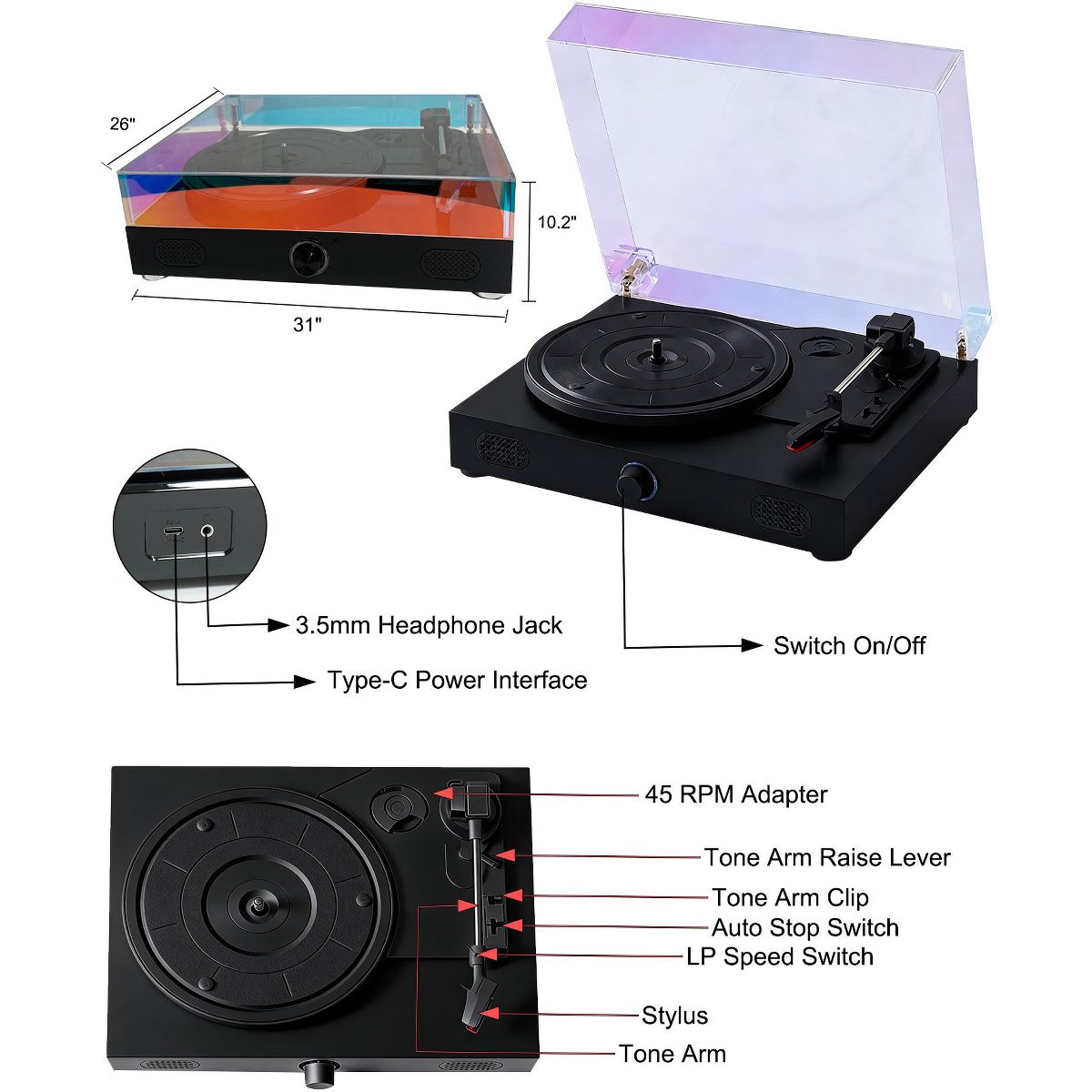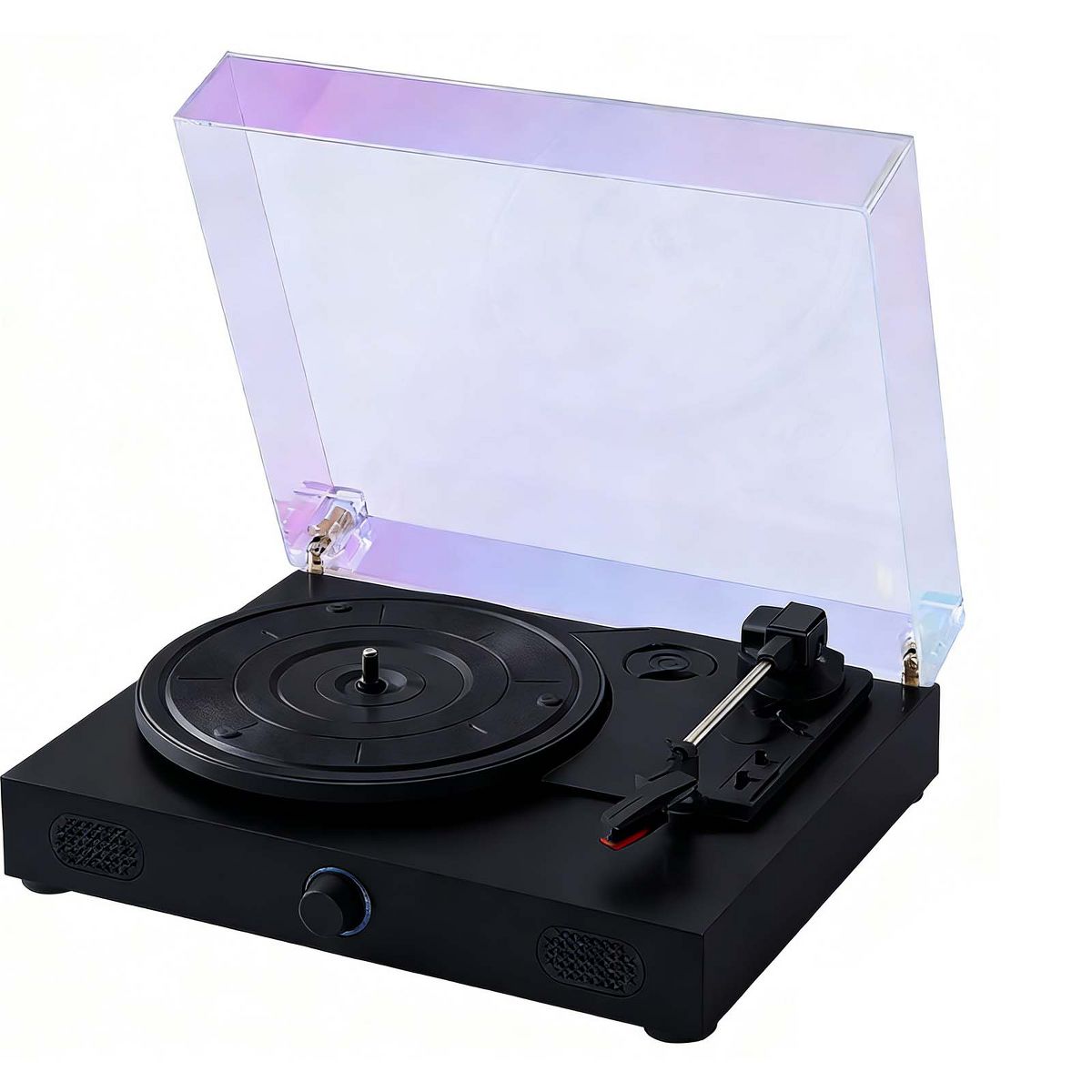 This record player features a clean, modern design that blends classic style with everyday functionality. The sleek white finish and dust cover add a decorative touch while fitting easily into bedrooms, living rooms, or home offices. Designed with a 3-speed belt-drive system, it supports multiple playback speeds and disc sizes for flexible listening. Built-in Bluetooth connectivity allows you to stream music from compatible devices or play audio through external Bluetooth speakers. With custom-tuned stereo speakers built in, this record player offers an all-in-one listening solution with no additional equipment required. Both functional and stylish, it serves as a music player and a home decor accent.