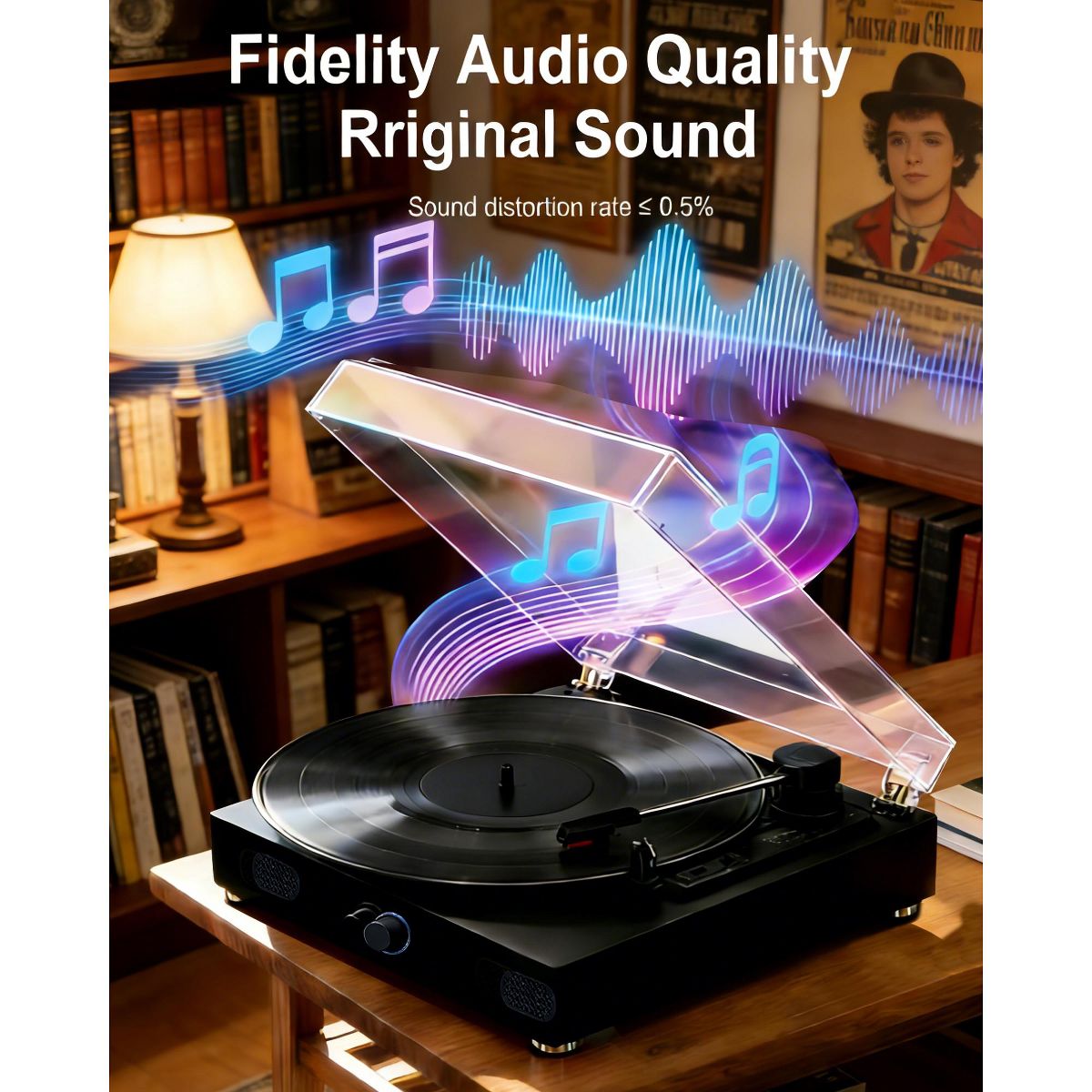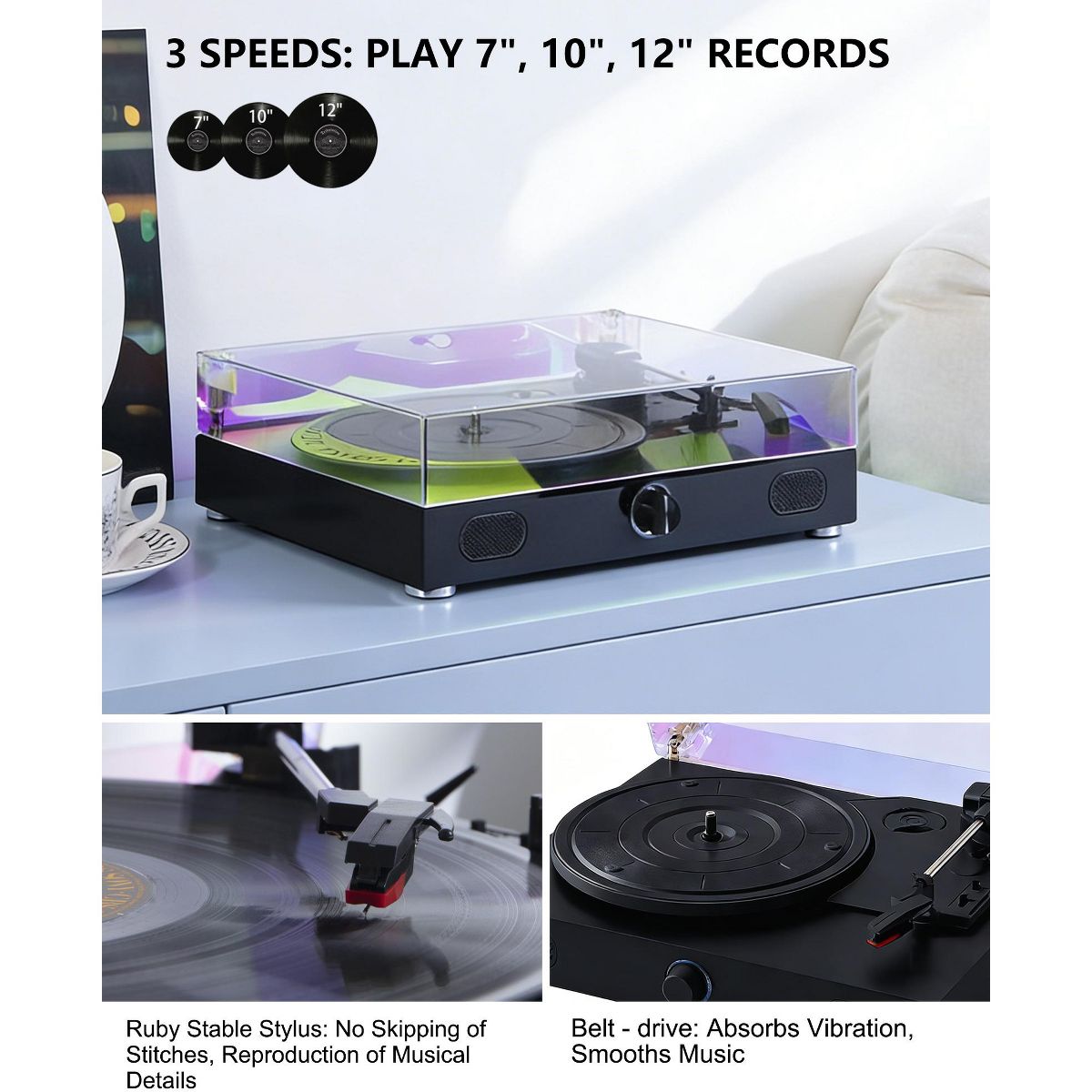 YARDSIGHT Record Player Turntable with Built-in Speakers, 3-Speed Belt-Drive for 7"/10"/12" Records, Retro Portable Turntable for Home Entertainment
