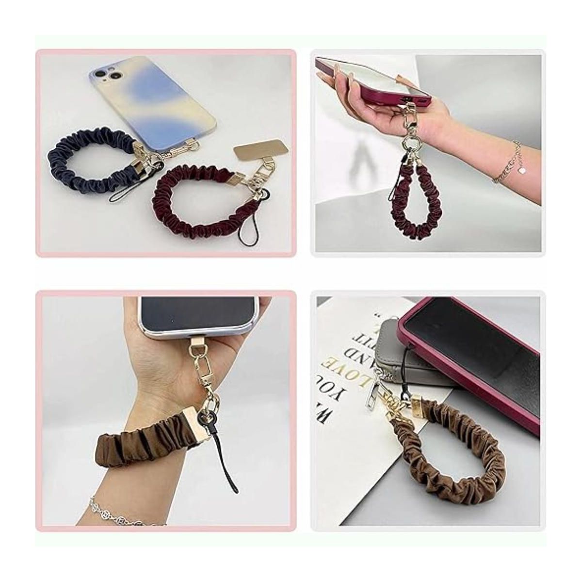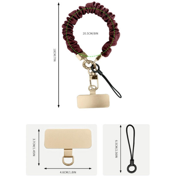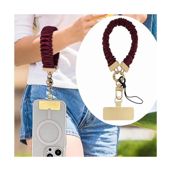 This adjustable 4-8 inch elastic phone wrist strap, made with high-stretch elastic and textured satin, ensures anti-slip grip during workouts/travel/commutes, features scratch-resistant gold alloy clasps for security, soft breathable fabric for all-day comfort, comes in 3 colors (Black/Burgundy/Ivory), includes key rings/carabiner/tool for multi-use (phones/keys/tablets up to 7.2 inches), and withstands 10,000+ stretches at 1.1oz for durable hands-free use.