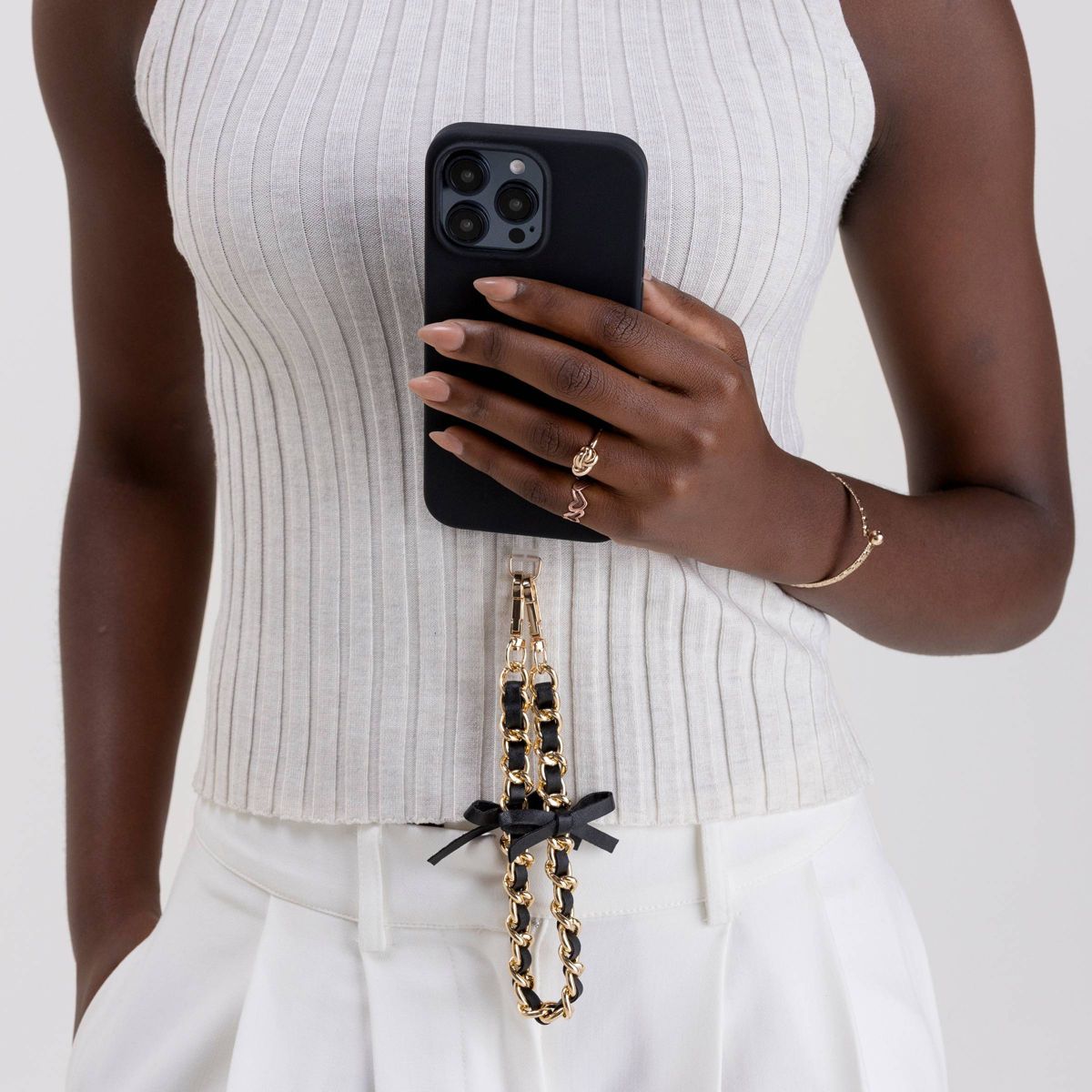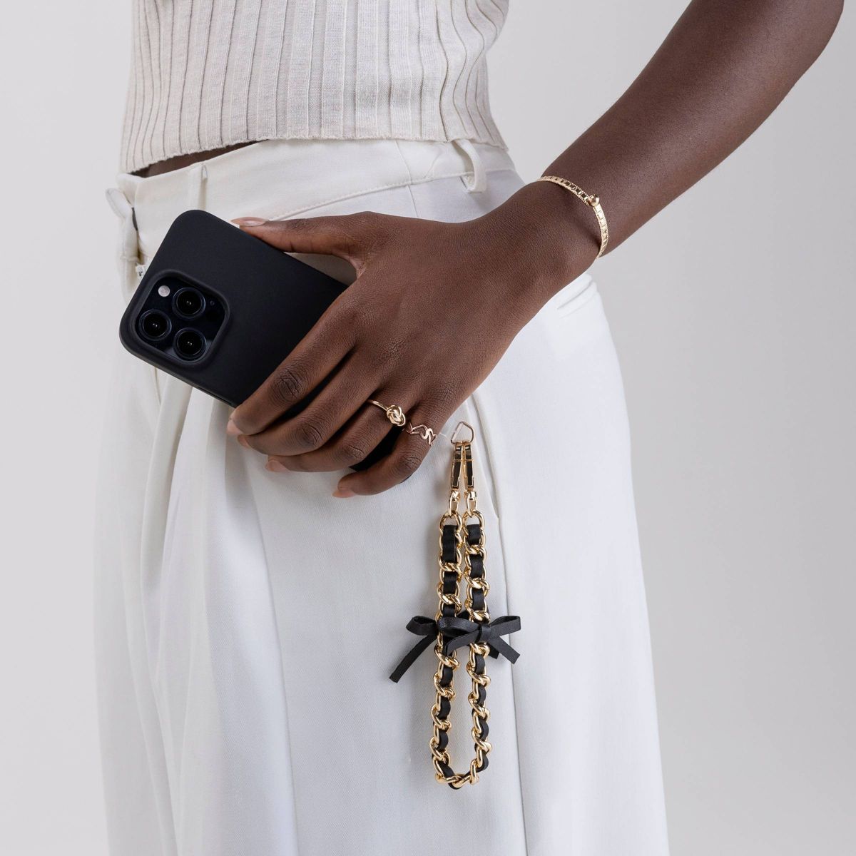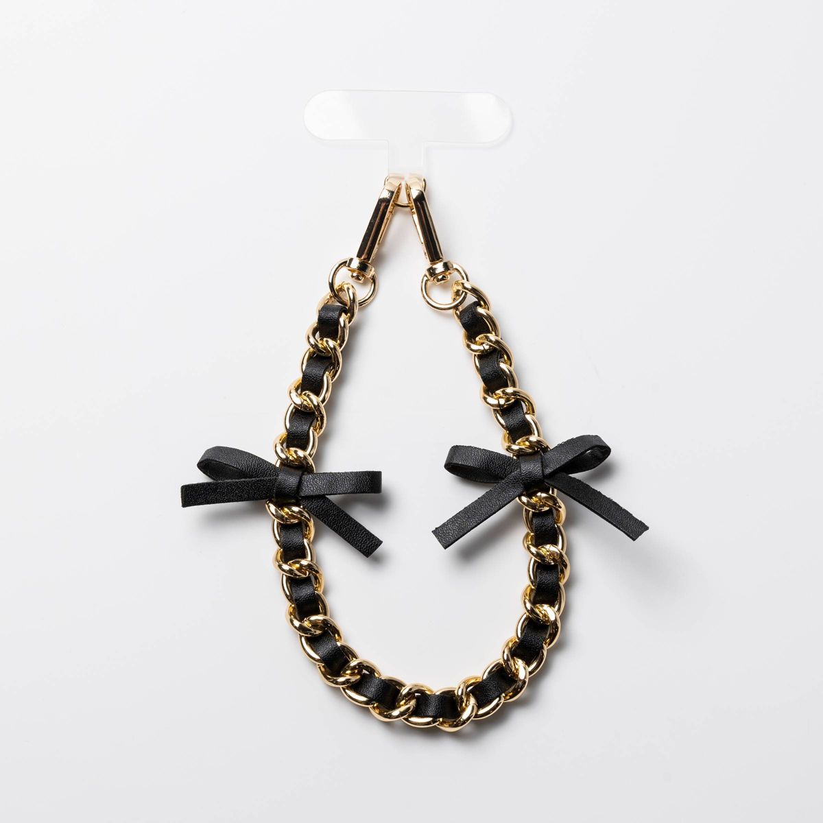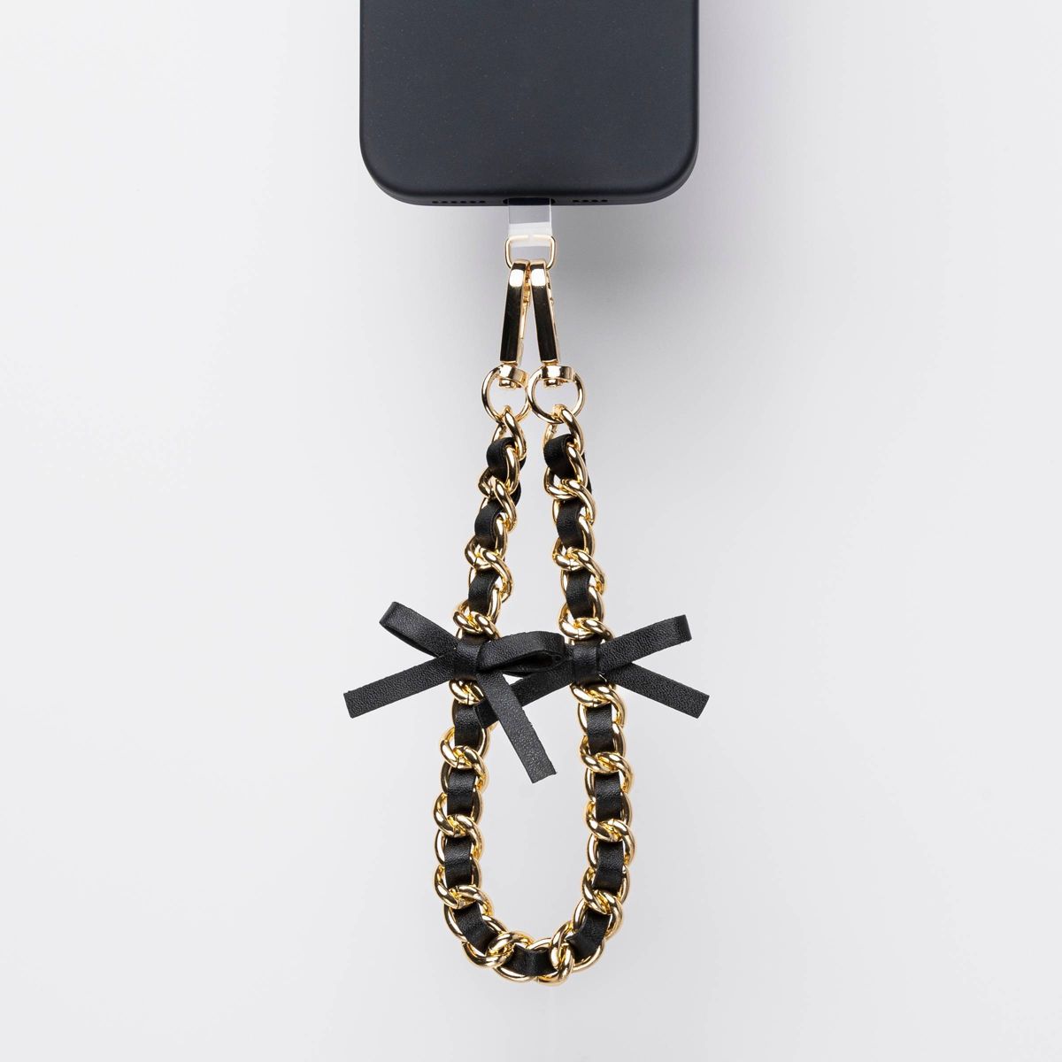 This Hello Lux Phone Wristlet combines a little edge with a lot of charm. The golden chain interlaced with faux black leather bows creates a look that feels both modern and classic, perfect for dressing up or down. The included universal phone connector card provides secure attachment to most phone cases. You can also clip this versatile wristlet strap to a small purse with the lobster-claw clasps. Its lightweight design rests comfortably on your wrist, keeping your hands free and your phone close.