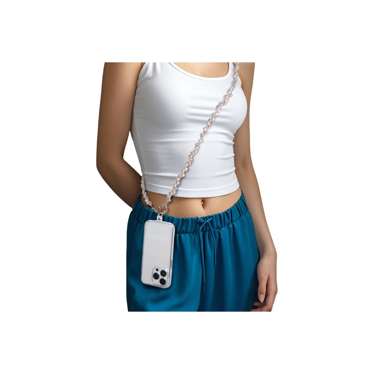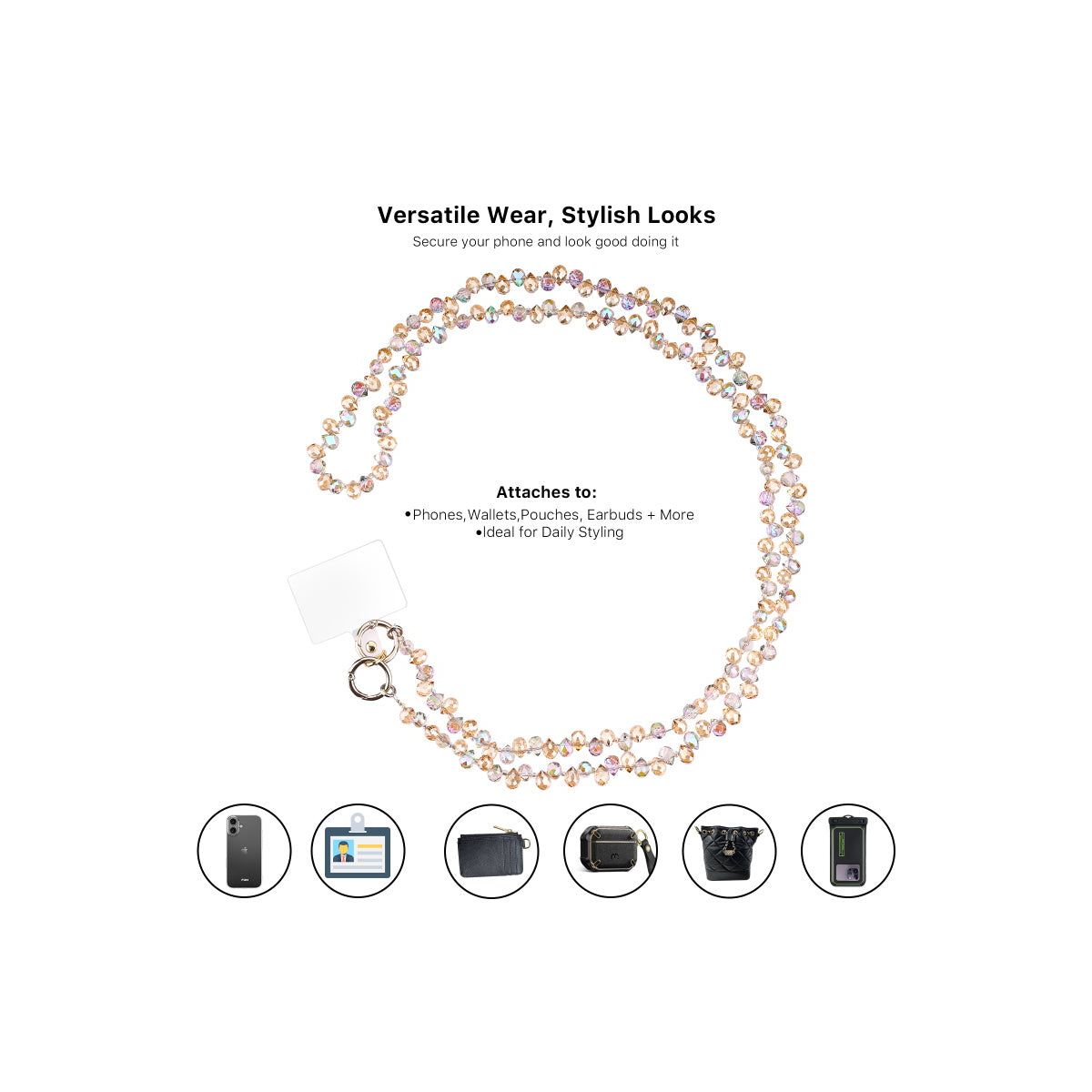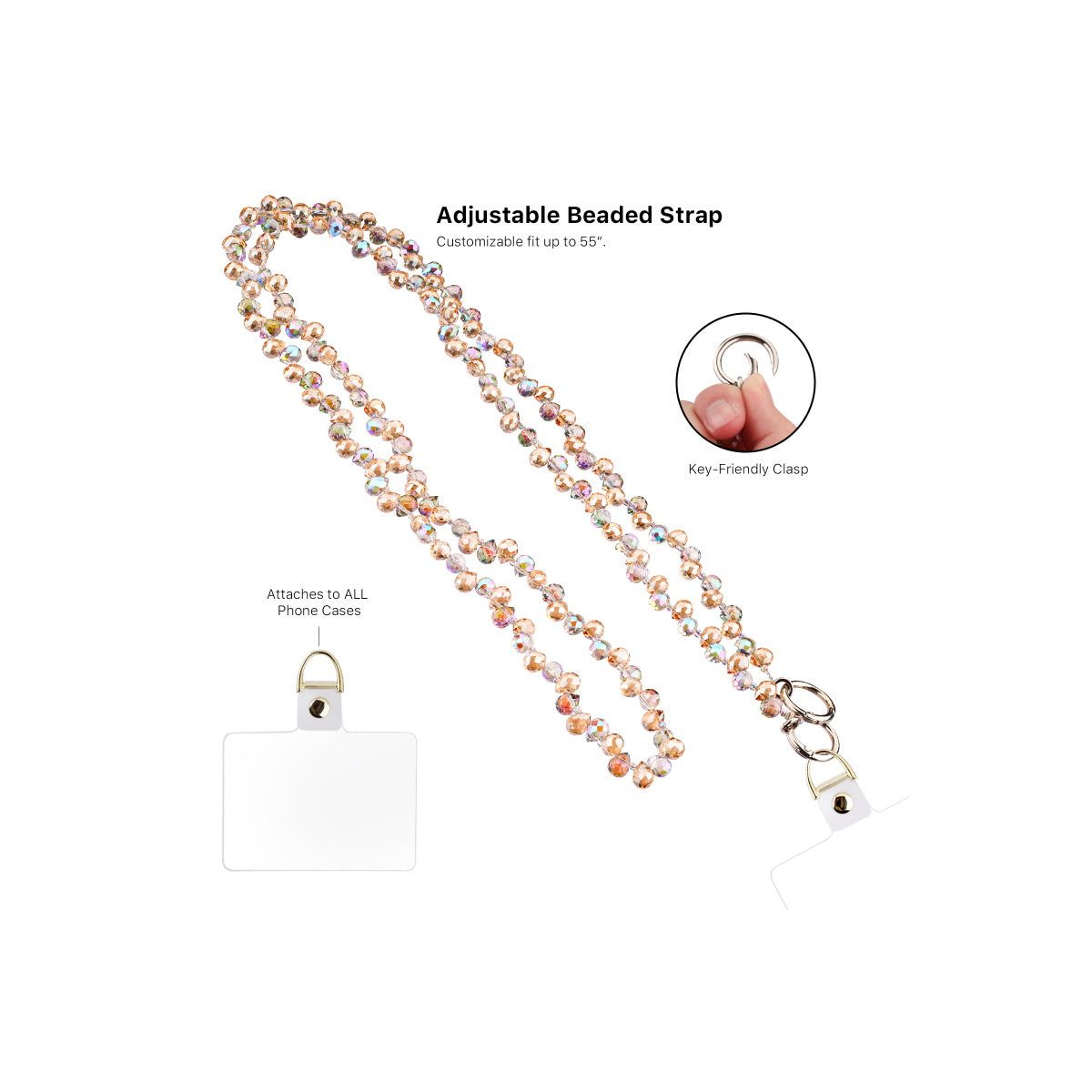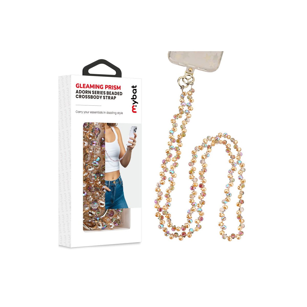 Sparkle with every step. Add a touch of shimmer to your everyday essentials with the MyBat Gleaming Prism Adorn Series Beaded Crossbody Strap. Featuring dazzling multicolor beads and polished silver-tone accents, this beaded phone strap offers a universal fit, attaching seamlessly to any phone case. The adjustable strap extends up to 55 inches, ensuring a perfect, comfortable fit whether worn as a crossbody or shoulder strap. Designed for both style and practicality, this hands-free phone chain keeps your phone secure with its fall-proof support, while the key-friendly clasp allows for easy attachment of keys or charms.