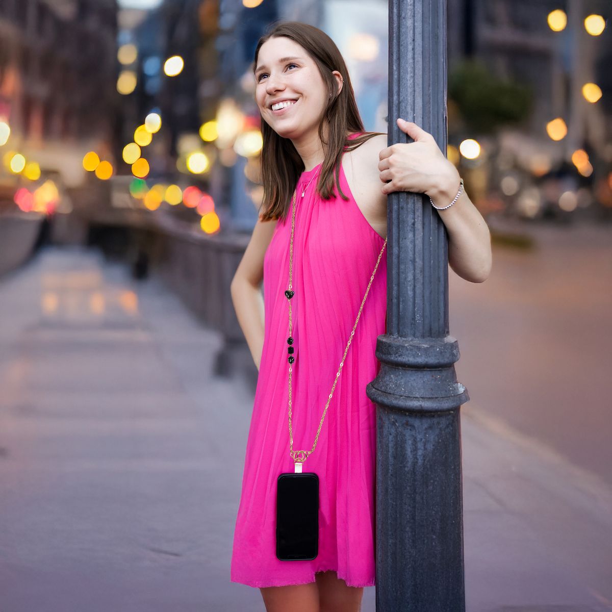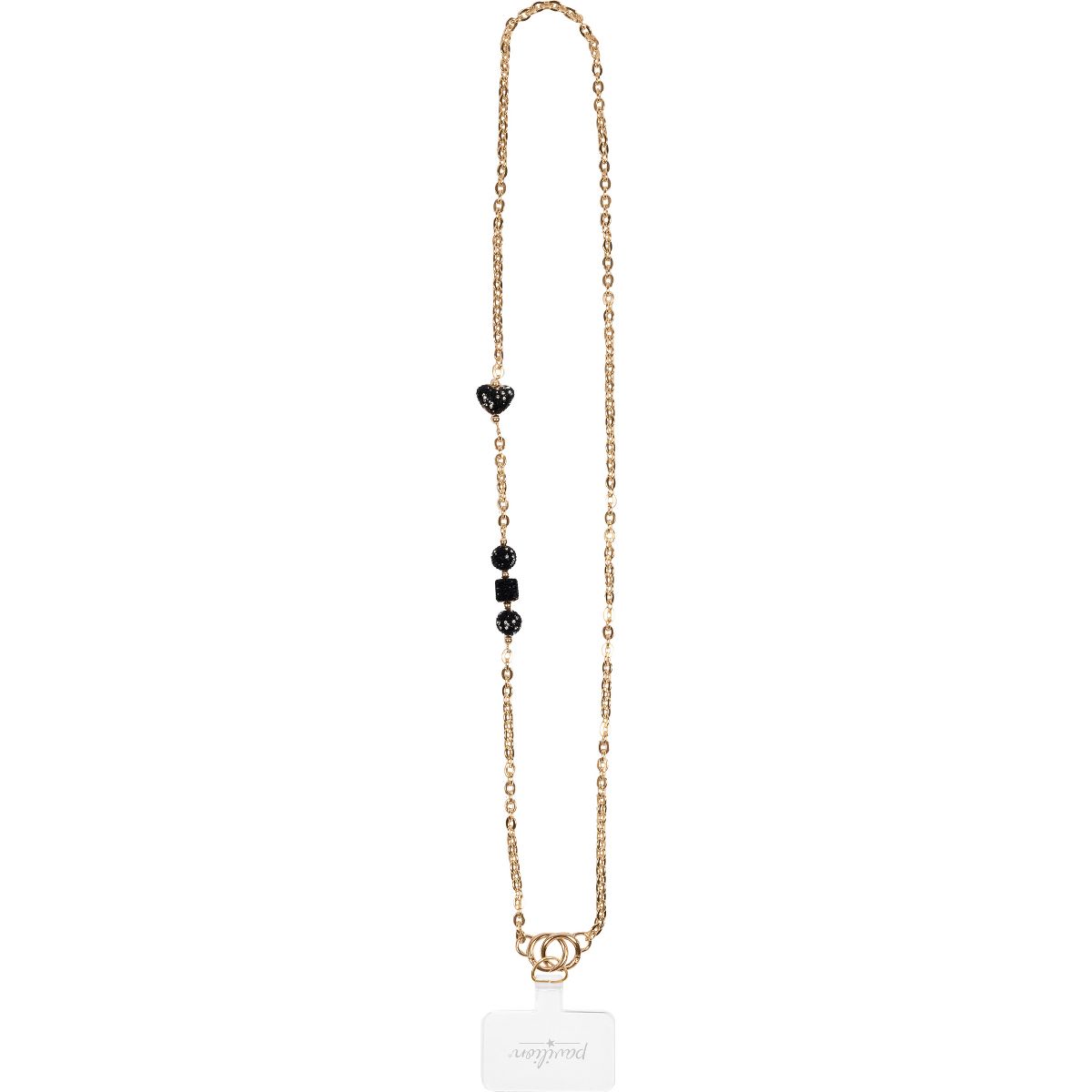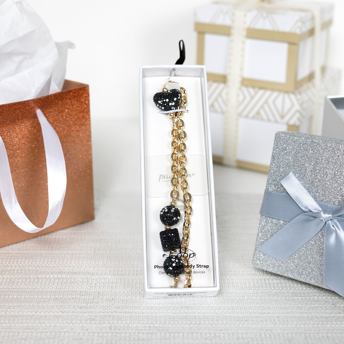The Black Crystal Crossbody Phone Chain is a sophisticated and functional accessory, designed with a 56-inch beaded gold chain featuring sleek black crystal accents and durable metal hardware. The elegant gemmed metal clasp securely attaches to a clear acrylic phone holder tab, ensuring compatibility with most phone cases. Designed for both style and convenience, this crossbody lanyard allows for hands-free carrying, making it ideal for travel, daily errands, or social outings. Its modern gold and black aesthetic pairs effortlessly with any outfit, adding a touch of glamour while keeping your phone easily accessible. The branded acrylic tab provides a secure attachment, making installation simple. This phone lanyard is a perfect gift for stylish professionals, fashion-forward individuals, and tech lovers, ideal for birthdays, holidays, or special occasions. Easy to maintain, just wipe clean with a soft cloth and avoid contact with moisture or harsh chemicals to preserve its finish. Packaged in a custom hanging gift box, this lanyard is ready for effortless gifting, making it a must-have for those who love a blend of fashion and function.