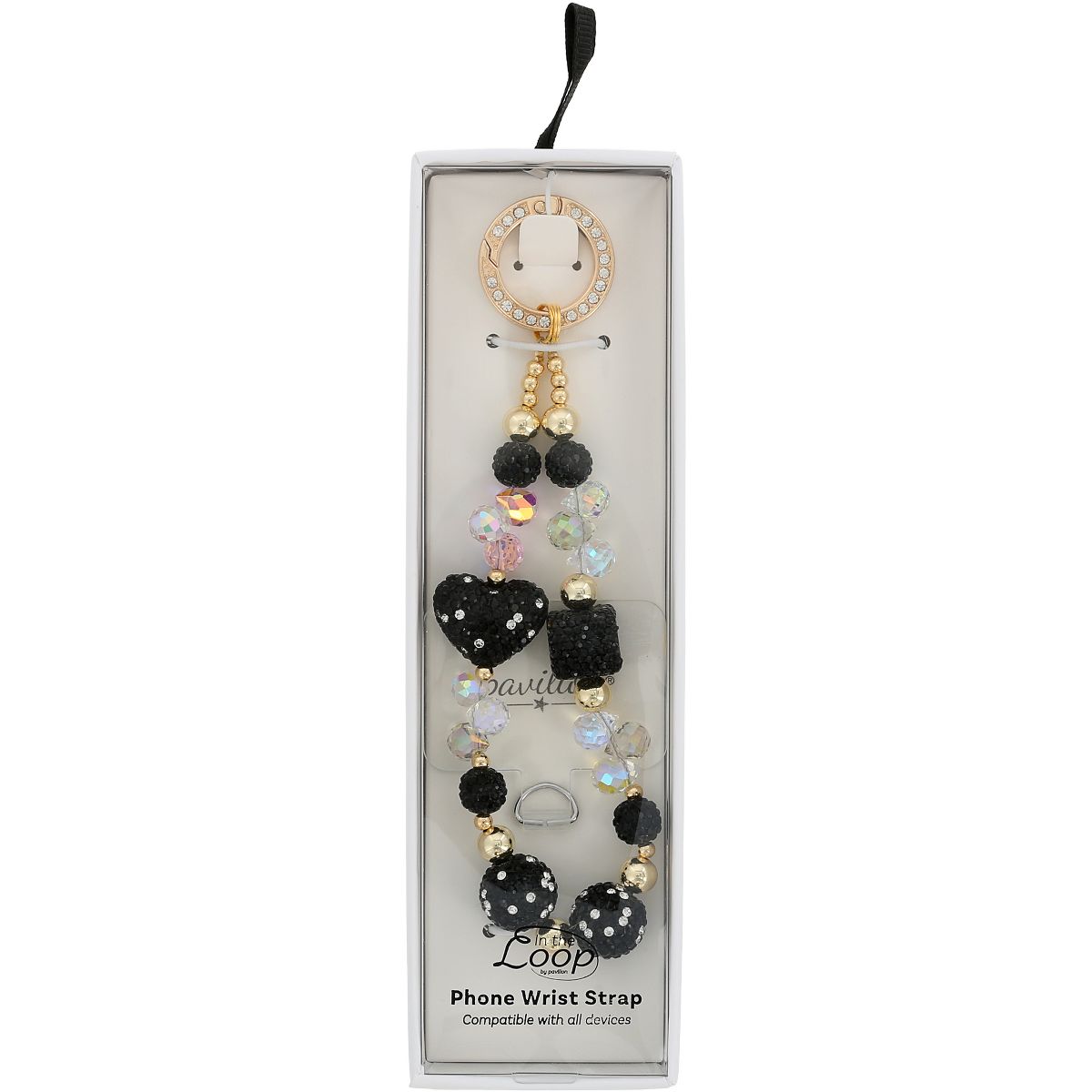 Pavilion Gift Company - Black Crystal Wristlet - Beaded Hands-Free Gold Wrist Strap - Cell Phone Accessories
