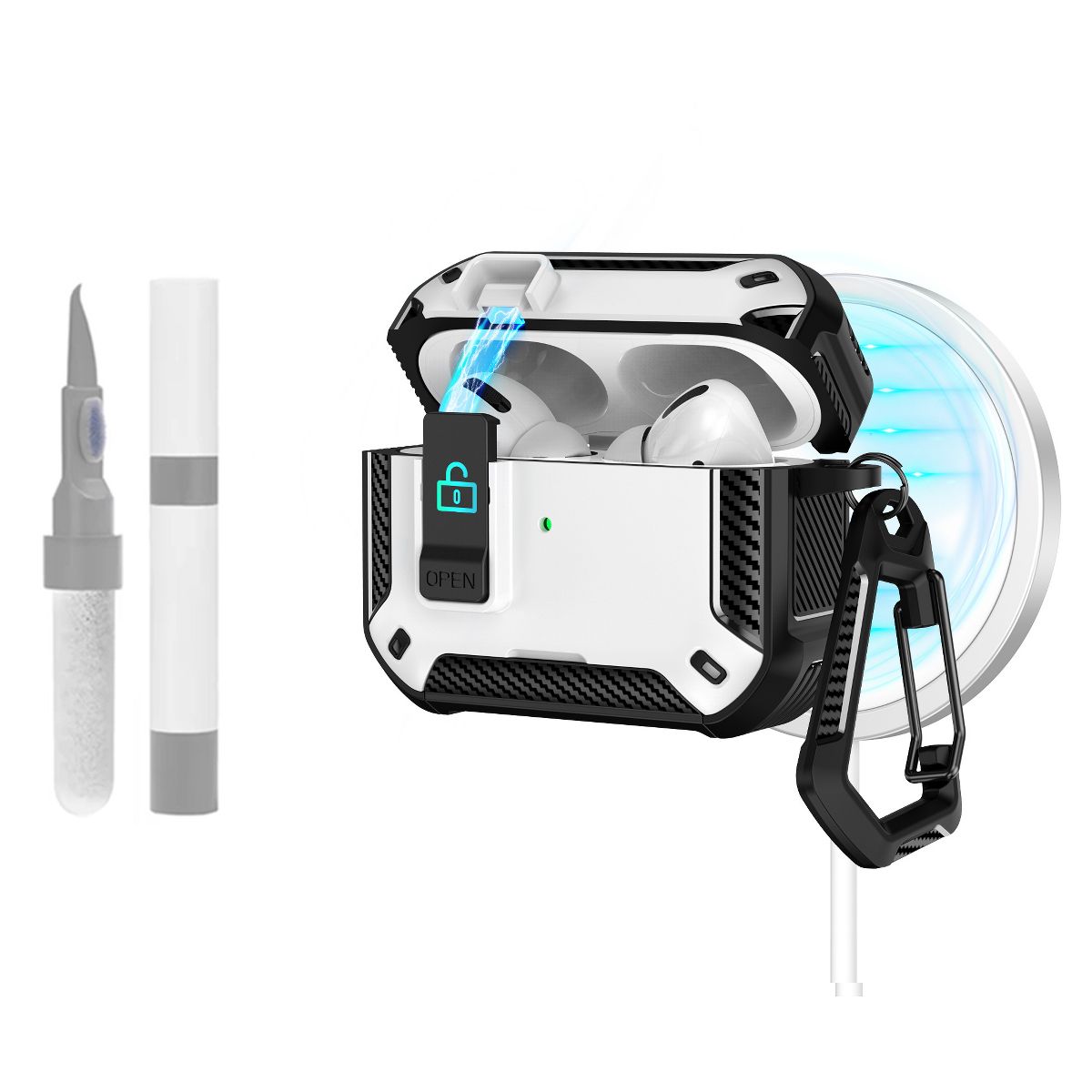 This protective case is exclusively designed for AirPods Pro 3, integrating three practical functions—back magnetic suction, a built-in phone holder, and a complimentary cleaning kit—to go beyond basic protection and meet daily user needs. Unlike standard AirPods cases that only shield the device, this cover solves three key pain points: its strong magnetic suction lets you attach the AirPods case to magnetic surfaces for easy access; the foldable phone holder transforms the case into a hands-free stand for watching videos or making calls; and the included cleaning kit keeps both your AirPods and case free from dust and earwax. Whether you’re commuting, working, or maintaining your device, this 3-in-1 case balances protection, convenience, and versatility for AirPods Pro 3 users.