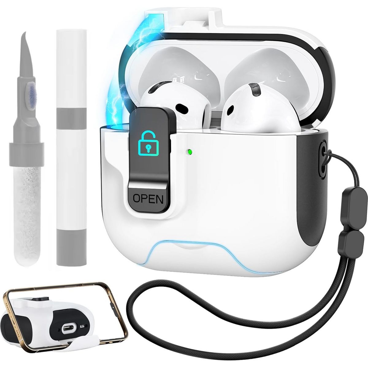 HTUTWOO for AirPods 4 Case with Secure Lock ,Automatic Magnetic Lock with Phone Holder Function,Shockproof Hard Protective Cover & Cleaner Kit-White