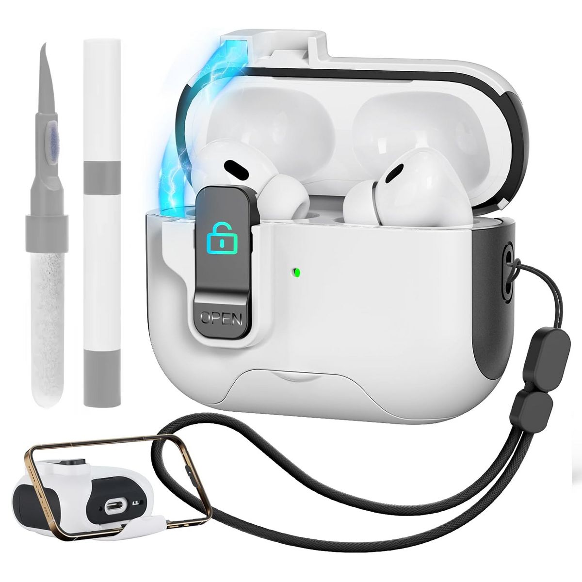 HTUTWOO for AirPods Pro 2nd/1st Generation Case, Shockproof Hard Protective Cover with Phone Holder, Cleaner Kit & Secure Lock-White