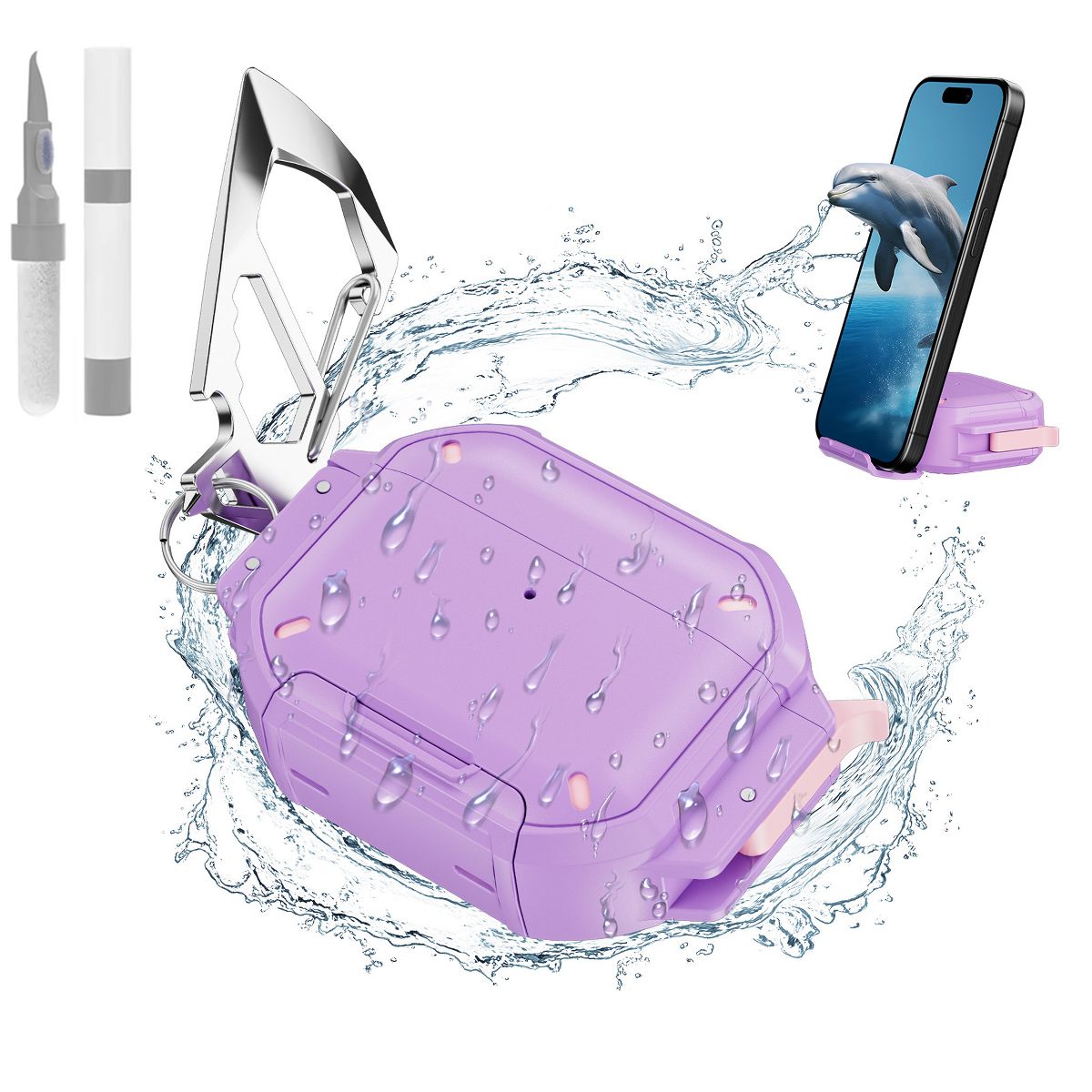 Protect and personalize your AirPods Pro 3 with this heavy-duty yet sleek hard shell case—engineered to shield your 3rd Gen earbuds from scratches, spills, and daily bumps, while adding convenient extras to simplify your routine. Unlike flimsy soft cases that tear easily or basic covers that lack practicality, this hard shell design solves 4 key pain points for AirPods users: its rigid, scratch-resistant shell repels scuffs from keys, bags, or desks; the waterproof coating blocks accidental splashes from seeping in and damaging your device; the included metal carabiner clips securely to backpacks, purses, or belt loops—so you never fumble to find your earbuds in a cluttered bag again; and the bonus cleaning kit lets you keep the case, earbud grilles, and charging port free from dust and debris.