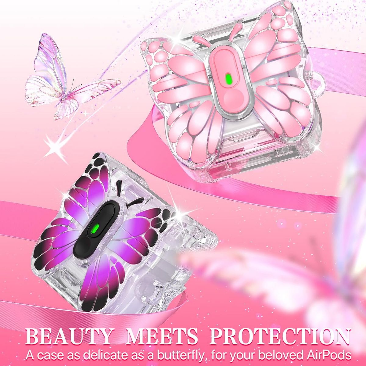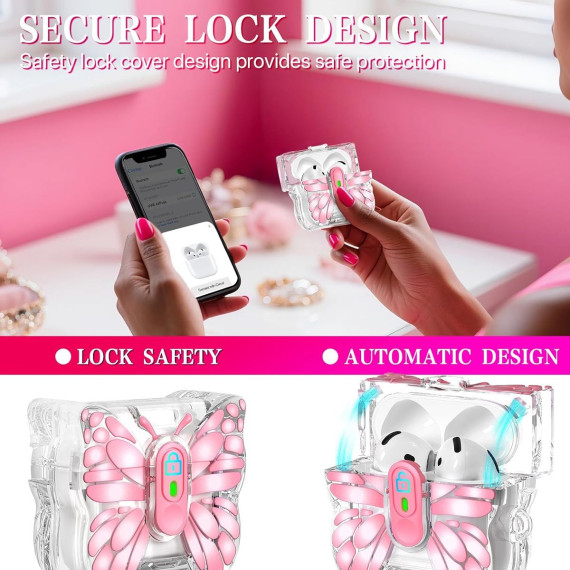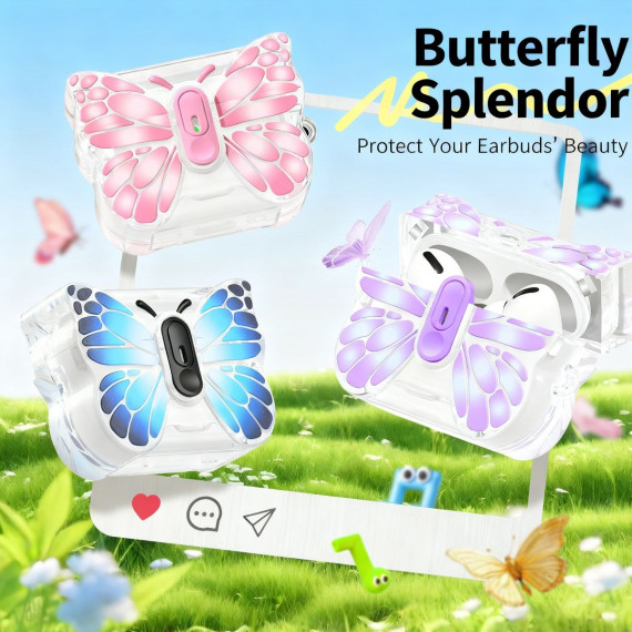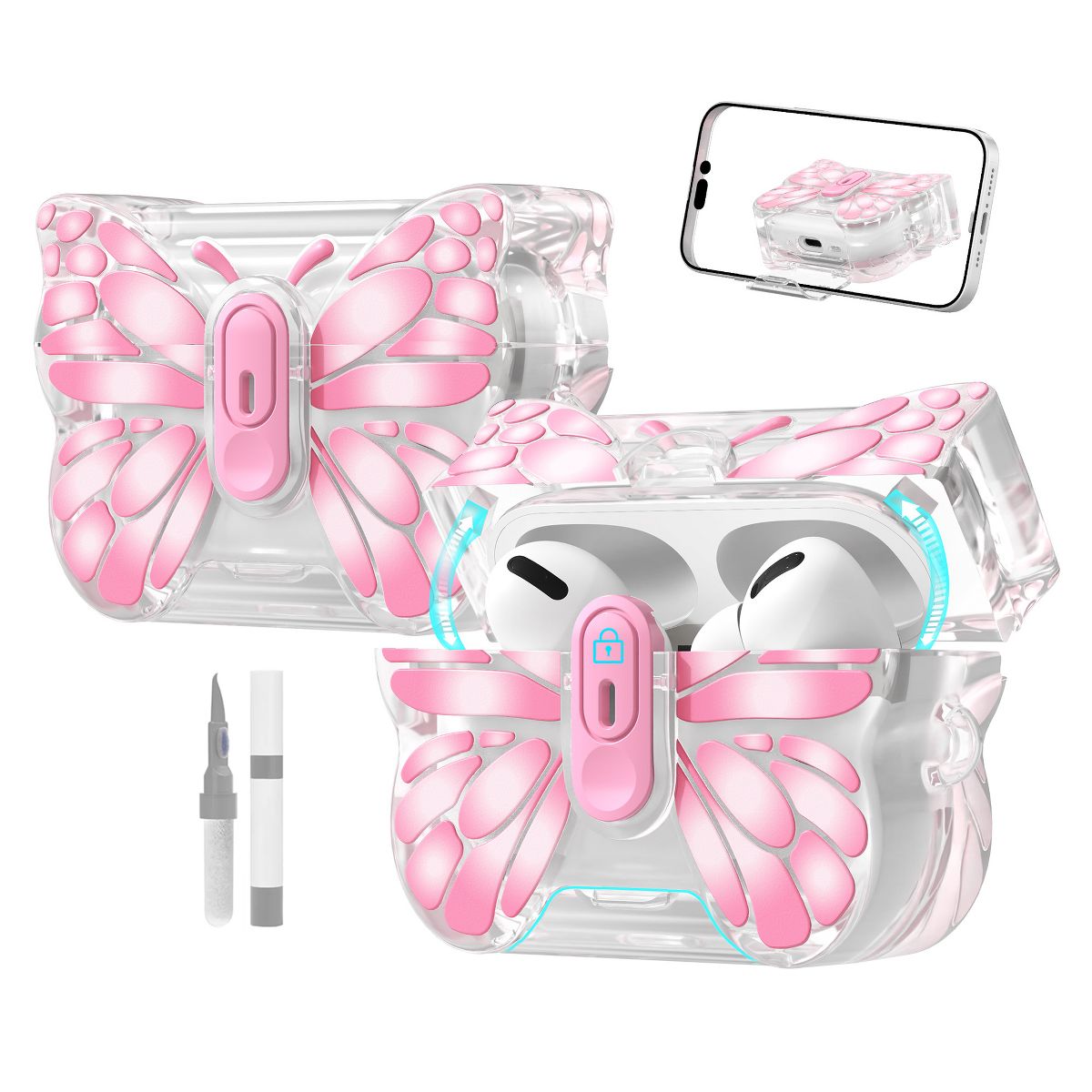 This case is exclusively designed for AirPods Pro 3, blending stylish aesthetics with practical functionality—featuring a transparent body adorned with a delicate butterfly pattern, anti-fall protection, an auto pop-up lid, a built-in kickstand, and a complementary cleaning kit. Unlike generic AirPods cases that sacrifice style for durability or lack user-friendly features, this cover solves four key pain points for AirPods Pro 3 owners: its transparent design showcases the original look of the earphone case while the butterfly pattern adds a subtle, elegant touch; the anti-fall structure absorbs impact from accidental drops, preventing scratches or cracks on the AirPods Pro 3 case; the auto pop-up lid opens smoothly and stays in place when needed, eliminating the hassle of stiff or loose lids that are hard to open; and the built-in kickstand lets you prop the case upright on desks or tables—convenient for checking battery status at a glance or keeping the case organized.