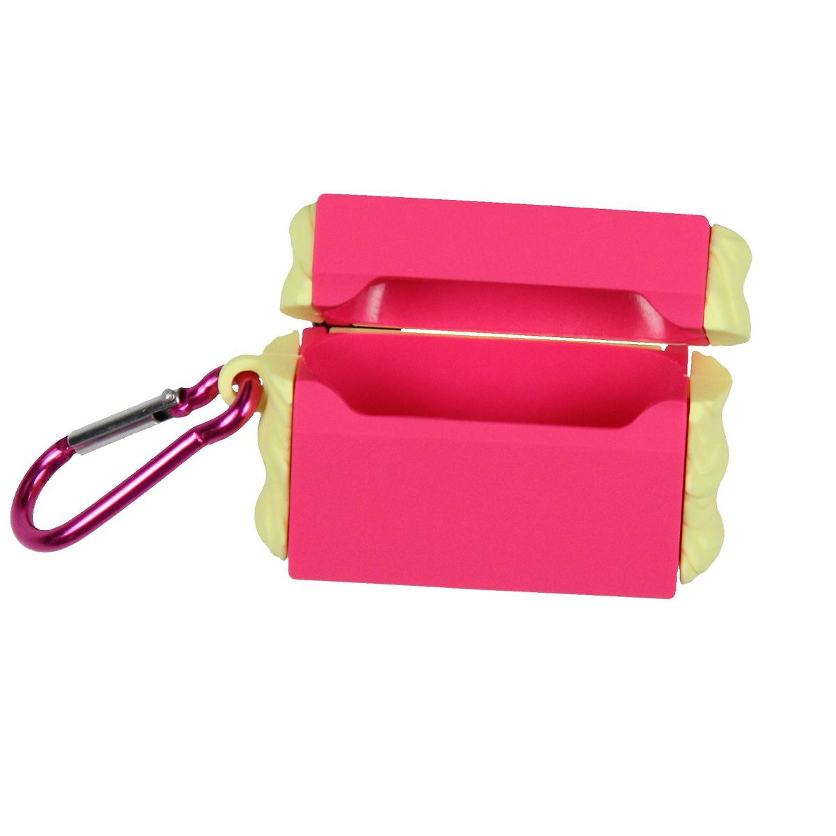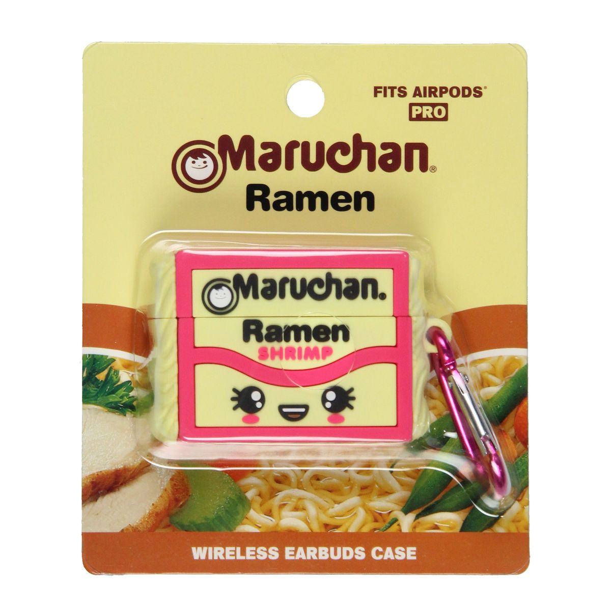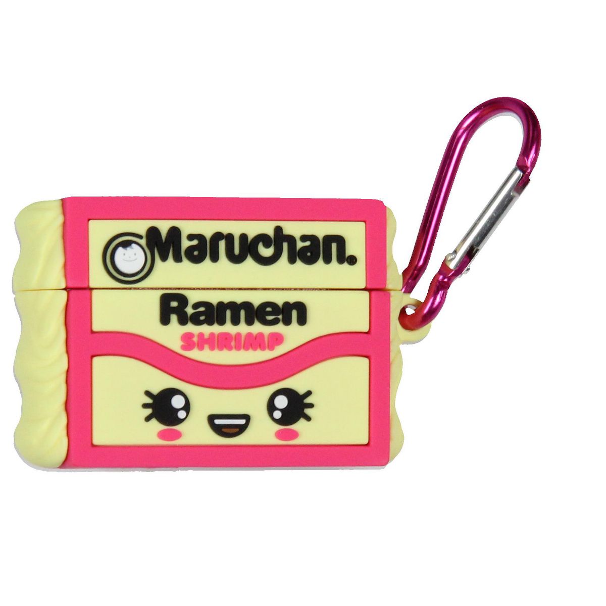 Protect your earbuds in style with the Maruchan Ramen wireless earbud case, designed to resemble the Magnificent square instant lunch noodles in Shrimp flavor. Sized to fit AirPods Pro, this case brings a touch of fun nostalgia to your everyday ensemble. Made from durable, quality silicone, it shields your earbuds from drops, scratches, and wear. The vibrant shrimp flavor-inspired packaging design adds a playful pop of color and personality. Equipped with a sturdy carabiner clip, this case easily attaches to backpacks, purses, belt loops, and more, ensuring your earbuds stay secure and within reach wherever you go.