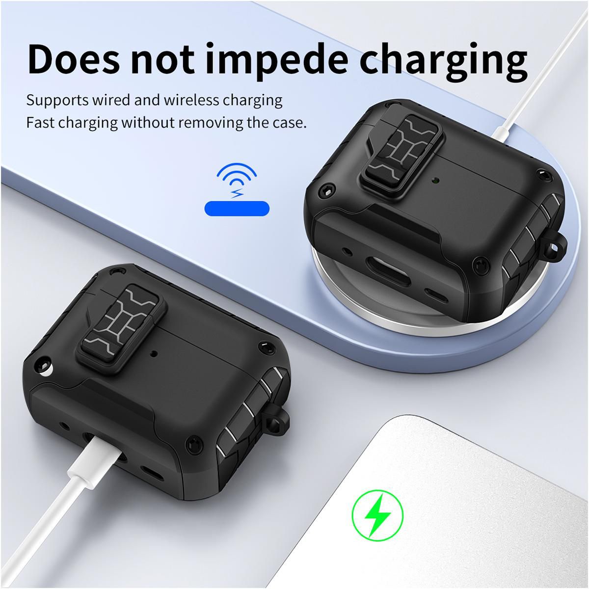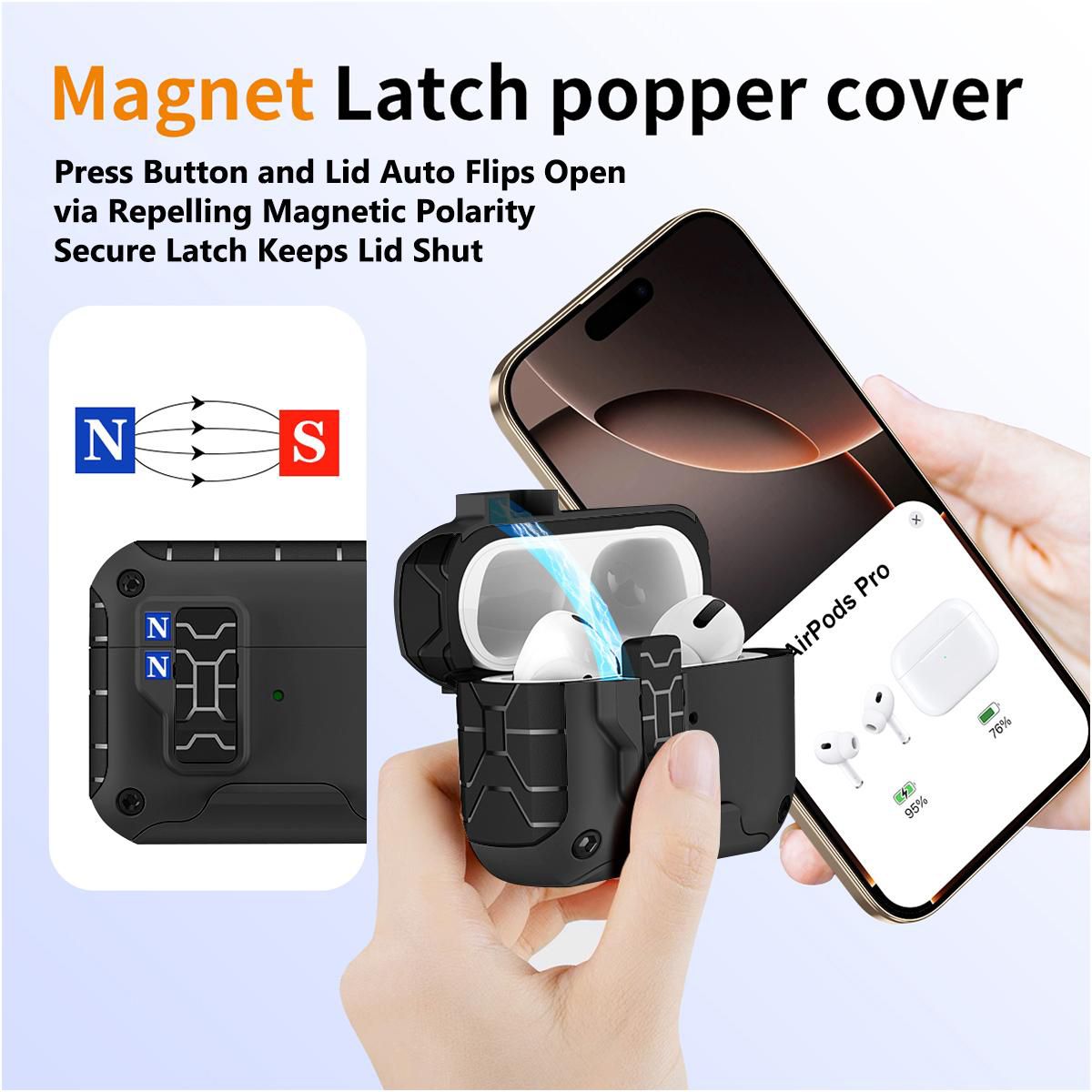 LIKE POLES REPEL: Magnets are also incorporated within the lid. Press the bottom button on the latch and your lid will spring open (as a result of same magnetic polarity). Such cool and useful technology that is convenient (and very satisfying to press). When you close the lid, you'll hear and feel the latch "click" secure. Enjoy peace of mind, knowing your Airpods Pro 3 are secure shut.