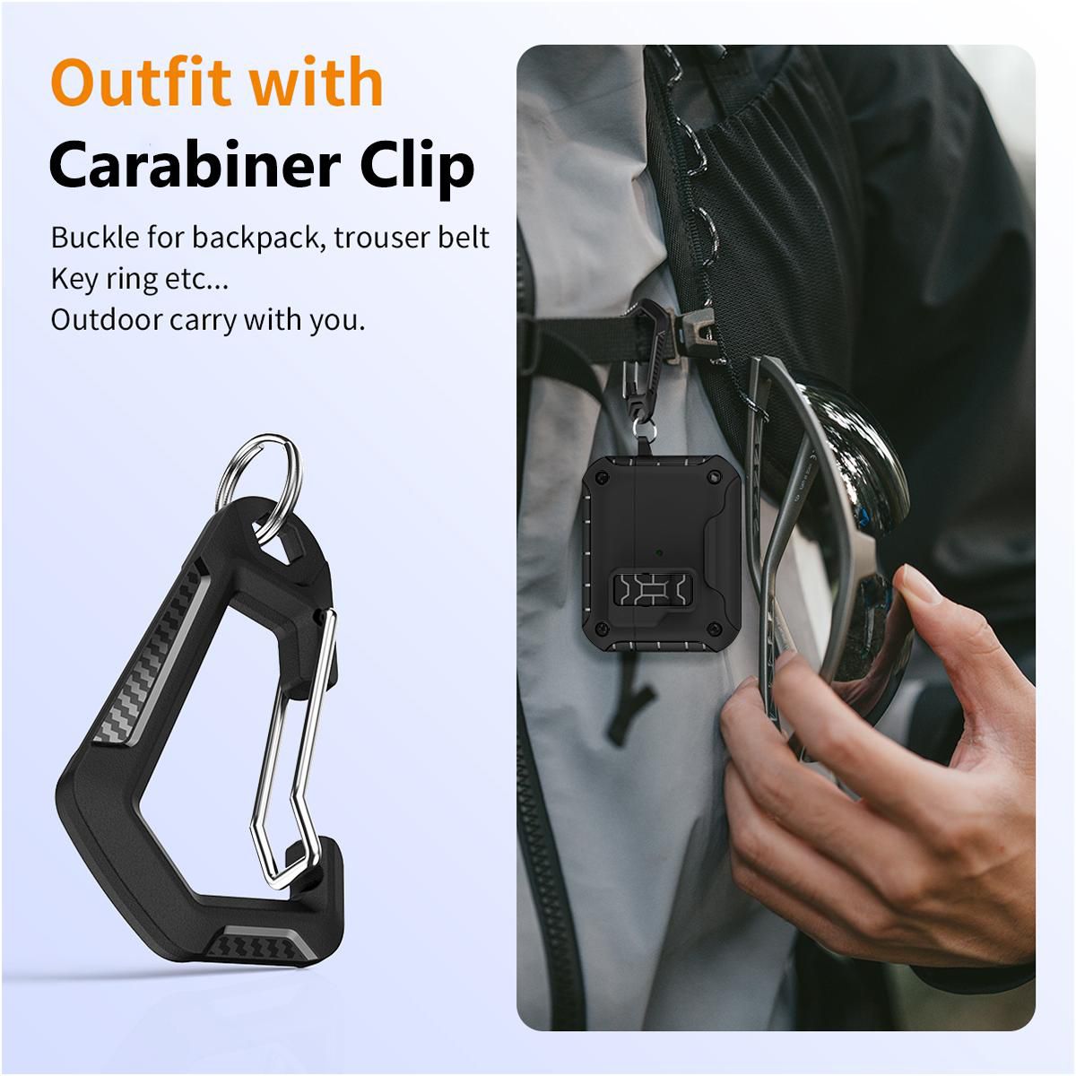 CARABINER CLIP: Attach the included clip to the side of the case. The carabiner is a versatile clip because you can attach to most anything: belt loop, backpack, strap, purse, keychain, etc.