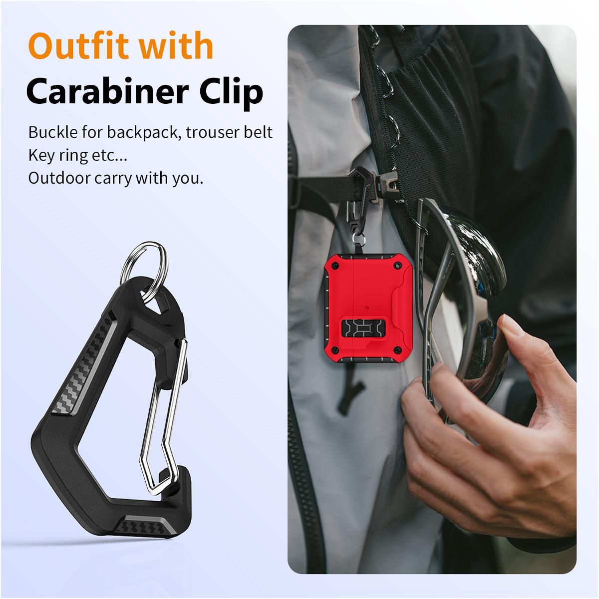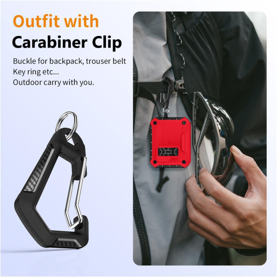CARABINER CLIP: Attach the included clip to the side of the case. The carabiner is a versatile clip because you can attach to most anything: belt loop, backpack, strap, purse, keychain, etc.