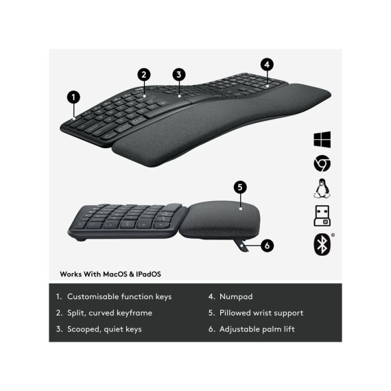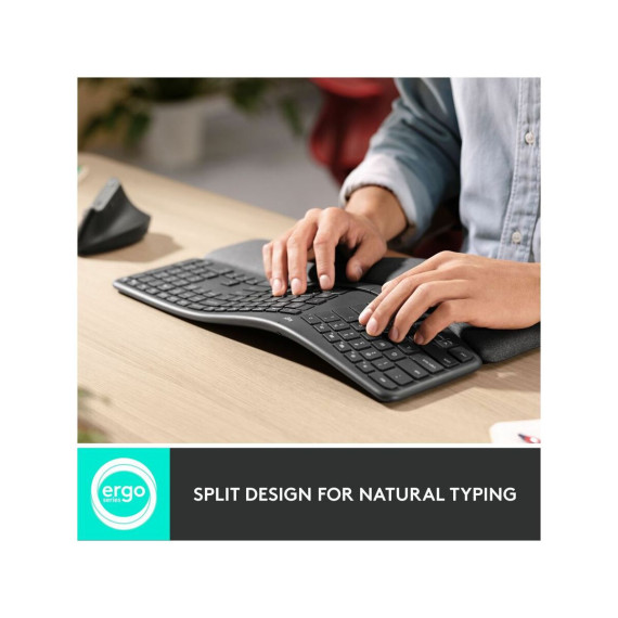 ERGO K860 for Business is a science-driven ergonomic keyboard with a curved, split keyframe and a fluid, ultra-precise typing experience. The included palm rest provides 54%* more wrist support and is proven to reduce muscle activity by 21%* in the upper trapezius muscle. This keyboard is uniquely designed for hours of comfortable typing.