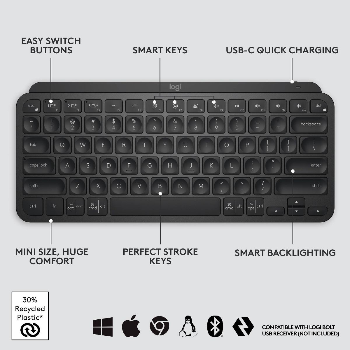 The backlit keys light up the moment your hands approach, and automatically adjust to suit changing lighting conditions. Smart Dictation, Mic Mute/Unmute, and Emoji keys streamline your workflow even further. Work seamlessly across multiple computers when you pair MX Keys Mini with a Flow-enabled MX Master 3 or MX Anywhere 3.